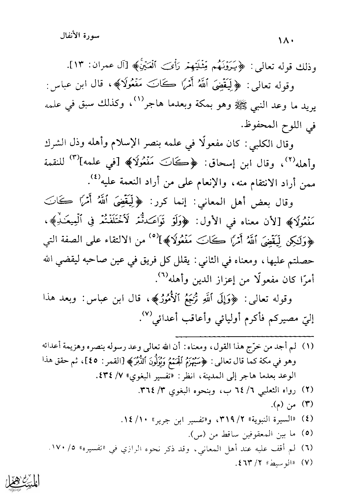 وقال بعض أهل المعاني: إنما كرر: {لِيَقْضِيَ اللَّهُ أَمْرًا كَانَ مَفْعُولًا} [لآن معناه في الأول: {وَلَوْ تَوَاعَدْتُمْ لَاخْتَلَفْتُمْ فِي الْمِيعَادِ} , {وَلَكِنْ لِيَقْضِيَ اللَّهُ أَمْرًا كَانَ مَفْعُولًا}] (¬5) من الالتقاء على الصفة التي حصلتم عليها، ومعناه في الثاني: يقلل كل فريق في عين صاحبه ليقضي الله أمرًا كان مفعولًا من إعزاز الدين وأهله (¬6).