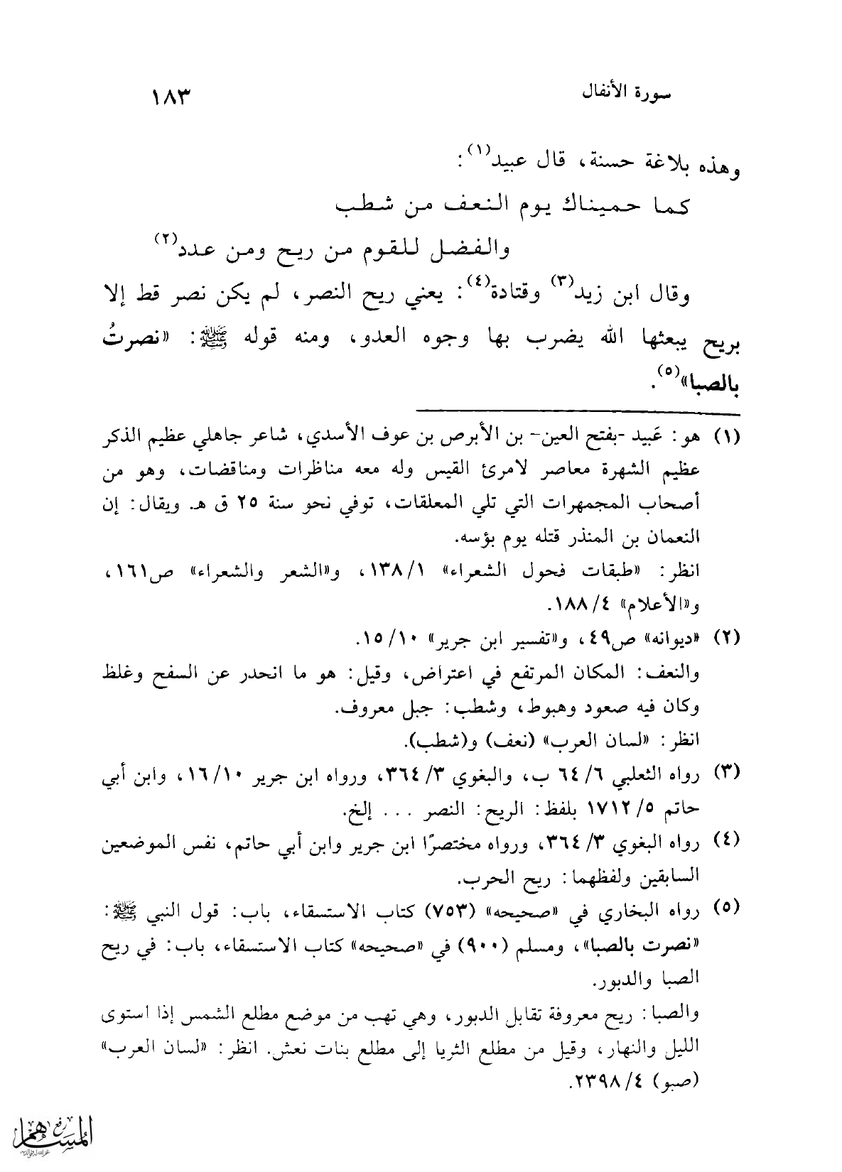 (¬4) رواه البغوي 3/ 364، ورواه مختصرًا ابن جرير وابن أبي حاتم، نفس الموضعين السابقين ولفظهما: ريح الحرب.