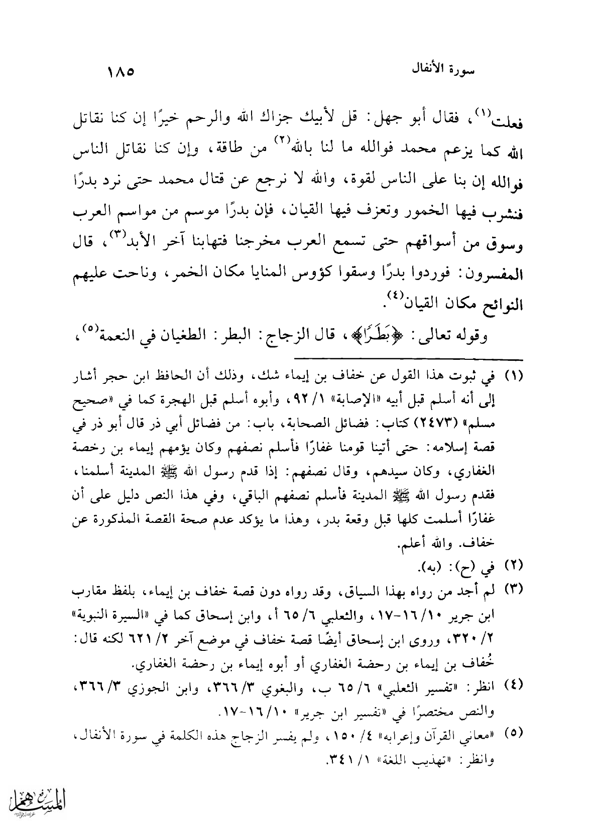 فعلت (¬1)، فقال أبو جهل: قل لأبيك جزاك الله والرحم خيرًا إن كنا نقاتل الله كما يزعم محمد فوالله ما لنا بالله (¬2) من طاقة، وإن كنا نقاتل الناس فوالله إن بنا على الناس لقوة، والله لا نرجع عن قتال محمد حتى نرد بدرًا فنشرب فيها الخمور وتعزف فيها القيان، فإن بدرًا موسم من مواسم العرب وسوق من أسواقهم حتى تسمع العرب مخرجنا فتهابنا آخر الأبد (¬3)، قال المفسرون: فوردوا بدرًا وسقوا كؤوس المنايا مكان الخمر، وناحت عليهم النوائح مكان القيان (¬4).
