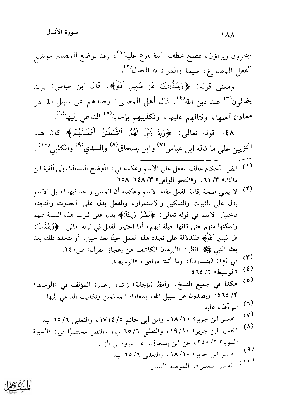(¬5) هكذا في جميع النسخ، ولفظ (بإجابة) زائد، وعبارة المؤلف في "الوسيط" 2/ 465: ويصدون عن سبيل الله، بمعاداة المسلمين وتكذيب الداعي إليها.