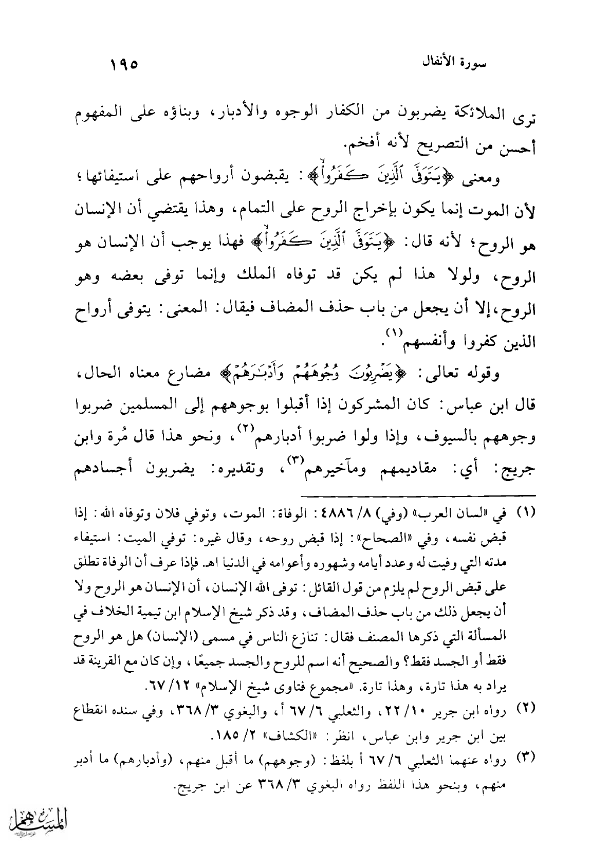 ومعنى {يَتَوَفَّى الَّذِينَ كَفَرُوا}: يقبضون أرواحهم على استيفائها؛ لأن الموت إنما يكون بإخراج الروح على التمام، وهذا يقتضي أن الإنسان هو الروح؛ لأنه قال: {يَتَوَفَّى الَّذِينَ كَفَرُوا} فهذا يوجب أن الإنسان هو الروح، ولولا هذا لم يكن قد توفاه الملك وإنما توفي بعضه وهو الروح، إلا أن يجعل من باب حذف المضاف فيقال: المعنى: يتوفى أرواح الذين كفروا وأنفسهم (¬1).