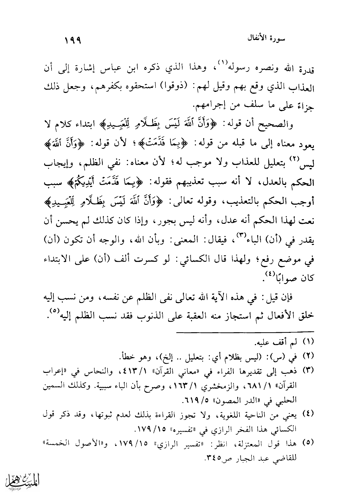 والصحيح أن قوله: {وَأَنَّ اللَّهَ لَيْسَ بِظَلَّامٍ لِلْعَبِيدِ} ابتداء كلام لا يعود معناه إلى ما قبله من قوله: {بِمَا قَدَّمَتْ} لأن قوله: {وَأَنَّ اللَّهَ} ليس (¬2) بتعليل للعذاب ولا موجب له؛ لأن معناه: نفي الظلم، وإيجاب الحكم بالعدل، لا أنه سبب تعذيبهم فقوله: {بِمَا قَدَّمَتْ أَيْدِيكُمْ} سبب أوجب الحكم بالتعذيب، وقوله تعالى: {وَأَنَّ اللَّهَ لَيْسَ بِظَلَّامٍ لِلْعَبِيدِ} نعت لهذا الحكم أنه عدل، وأنه ليس بجور، وإذا كان كذلك لم يحسن أن يقدر في (أن) الباء (¬3)، فيقال: المعنى: وبأن الله، والوجه أن تكون (أن) في موضع رفع، ولهذا قال الكسائي: لو كسرت ألف (أن) على الابتداء كان صوابًا (¬4).