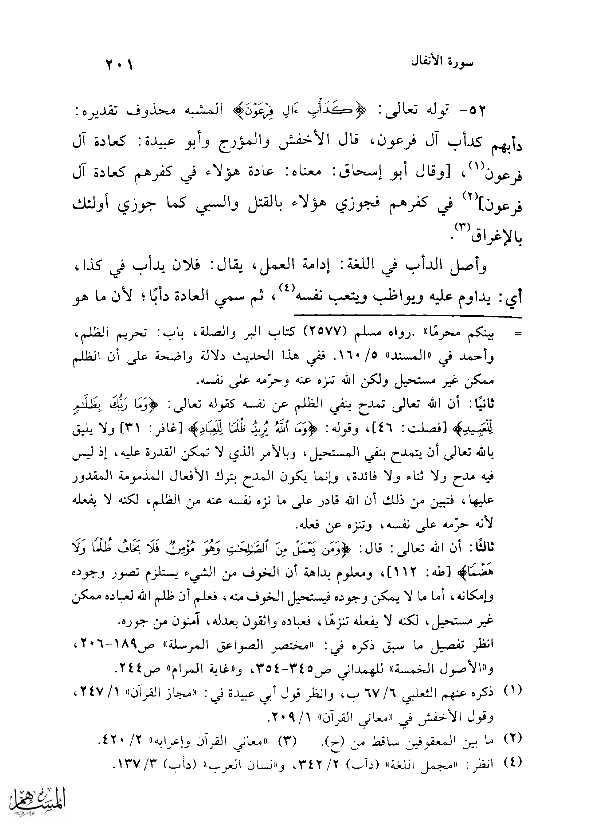52 - قوله تعالى: {كَدَأْبِ آلِ فِرْعَوْنَ} المشبه محذوف تقديره: دأبهم كدأب آل فرعون، قال الأخفش والمؤرج وأبو عبيدة: كعادة آل فرعون (¬1)، [وقال أبو إسحاق: معناه: عادة هؤلاء في كفرهم كعادة آل فرعون] (¬2) في كفرهم فجوزي هؤلاء بالقتل والسبي كما جوزي أولئك بالإغراق (¬3).