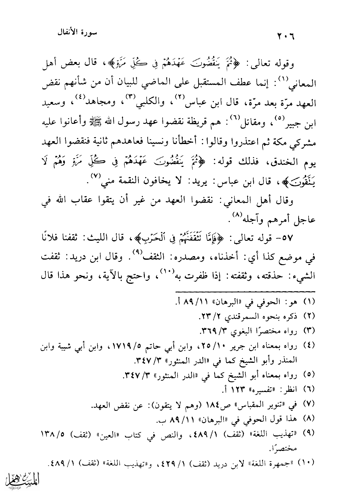 57 - قوله تعالى: {فَإِمَّا تَثْقَفَنَّهُمْ فِي الْحَرْبِ}، قال الليث: ثقفنا فلانًا في موضع كذا أي: أخذناه، ومصدره: الثقف (¬9). وقال ابن دريد: ثقفت الشيء: حذقته، وثقفته: إذا ظفرت به (¬10)، واحتج بالآية، ونحو هذا قال