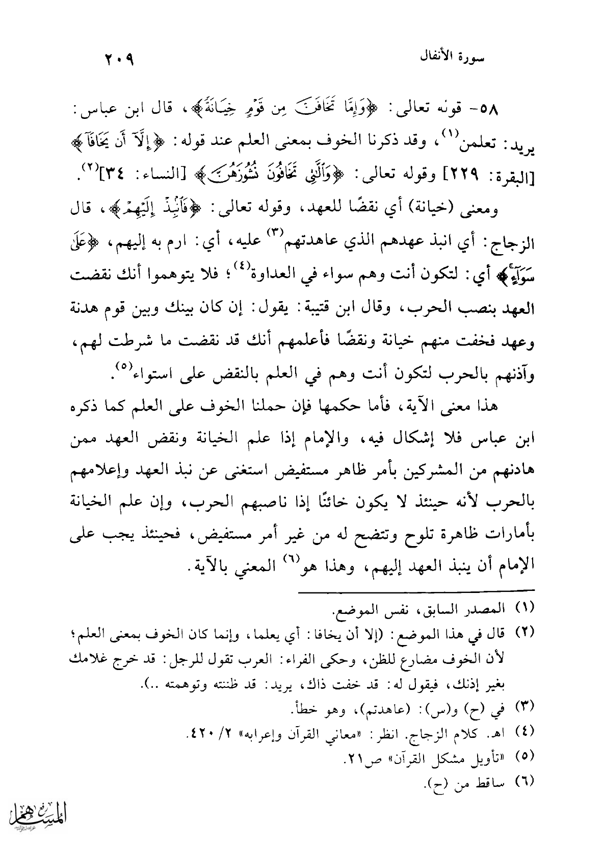 58 - قوله تعالى: {وَإِمَّا تَخَافَنَّ مِنْ قَوْمٍ خِيَانَةً}، قال ابن عباس: يريد: تعلمن (¬1)، وقد ذكرنا الخوف بمعنى العلم عند قوله: {إِلَّا أَنْ يَخَافَا} [البقرة: 229] وقوله تعالى: {وَاللَّاتِي تَخَافُونَ نُشُوزَهُنَّ} [النساء: 34] (¬2).