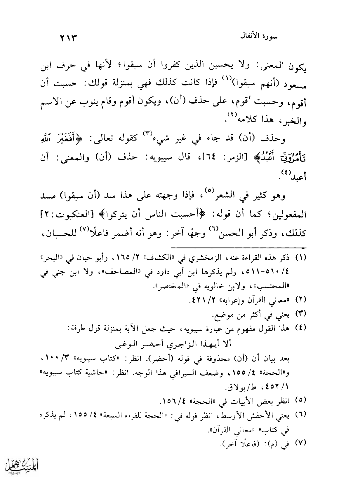 يكون المعنى: ولا يحسبن الذين كفروا أن سبقوا؛ لأنها في حرف ابن مسعود (أنهم سبقوا) (¬1) فإذا كانت كذلك فهي بمنزلة قولك: حسبت أن أقوم، وحسبت أقوم، على حذف (أن)، ويكون أقوم وقام ينوب عن الاسم والخبر، هذا كلامه (¬2).