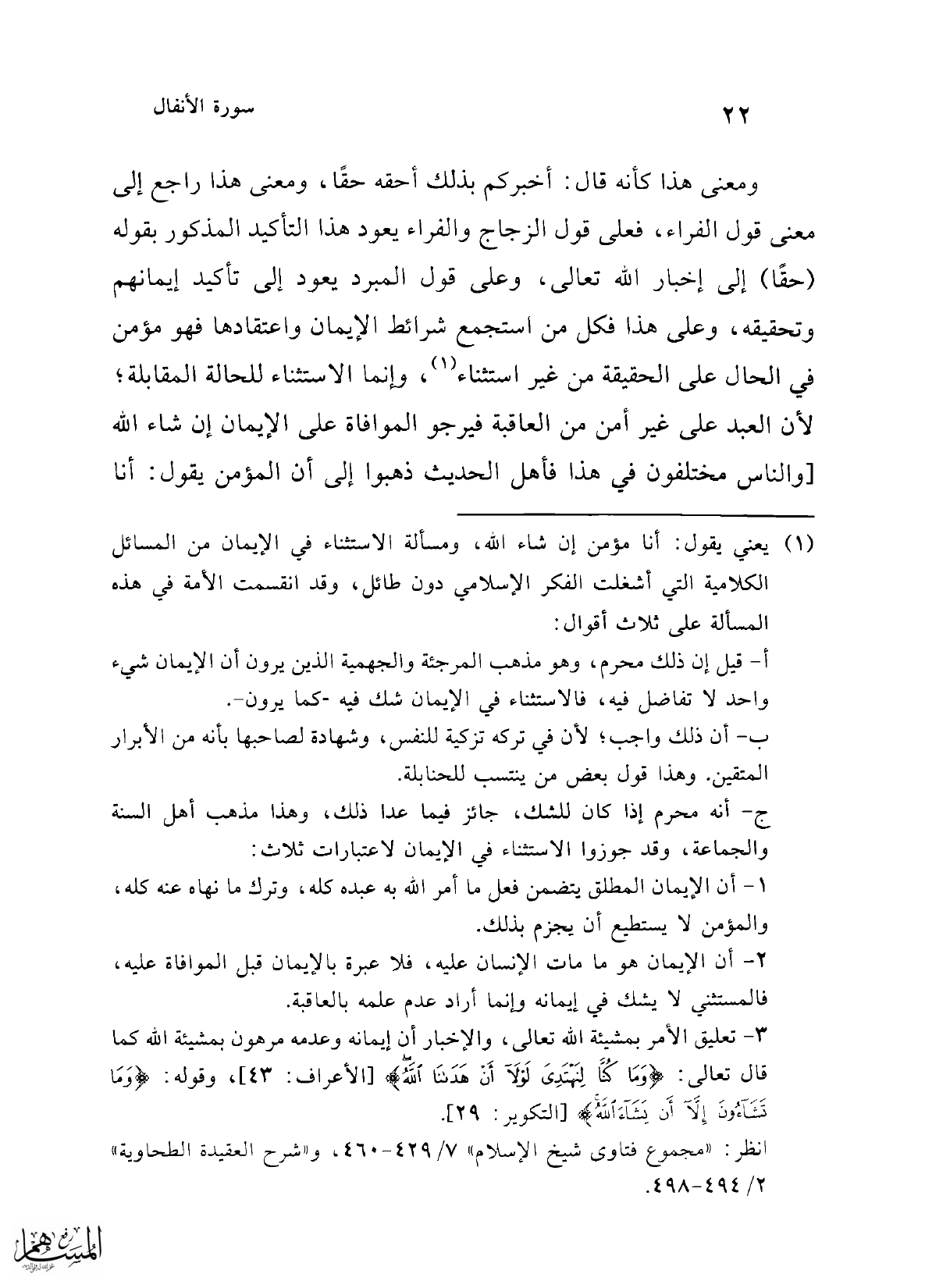 (¬1) يعني يقول: أنا مؤمن إن شاء الله، ومسألة الاستثناء في الإيمان من المسائل الكلامية التي أشغلت الفكر الإسلامي دون طائل، وقد انقسمت الأمة في هذه المسألة على ثلاث أقوال: