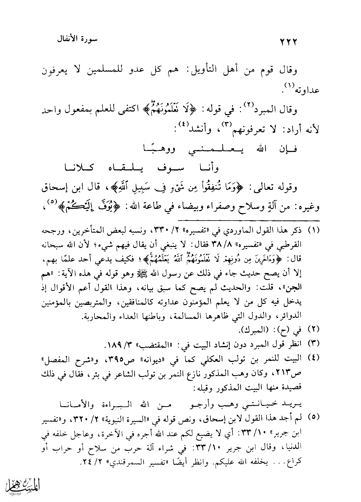 وقال المبرد (¬2): في قوله: {لَا تَعْلَمُونَهُمُ} اكتفى للعلم بمفعول واحد لأنه أراد: لا تعرفونهم (¬3)، وأنشد (¬4):
