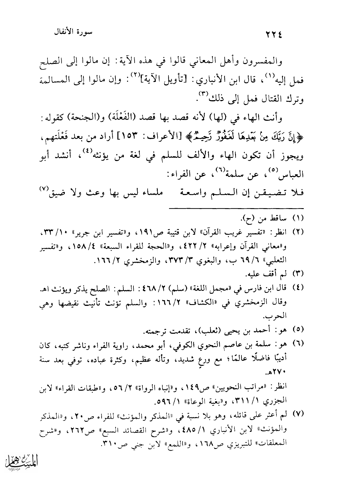 (¬6) هو: سلمة بن عاصم النحوي الكوفي، أبو محمد، راوية الفراء وناشر كتبه، كان أديبًا فاضلًا عالمًا؛ مع ورعٍ شديد، وتأله عظيم، وكثرة عباده، توفي بعد سنة 270 هـ.