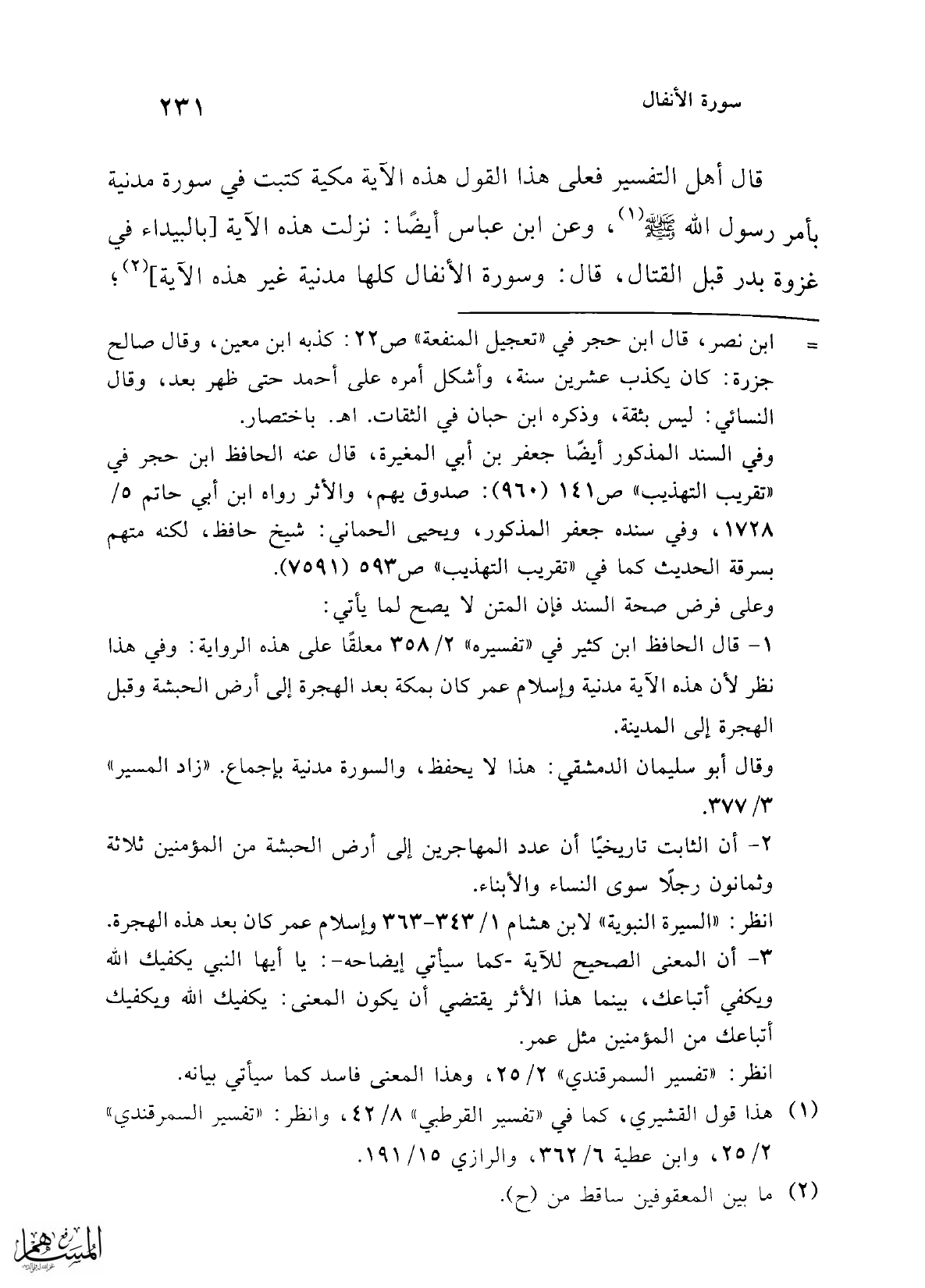 1 - قال الحافظ ابن كثير في "تفسيره" 2/ 358 معلقًا على هذه الرواية: وفي هذا نظر لأن هذه الآية مدنية وإسلام عمر كان بمكة بعد الهجرة إلى أرض الحبشة وقبل الهجرة إلى المدينة.