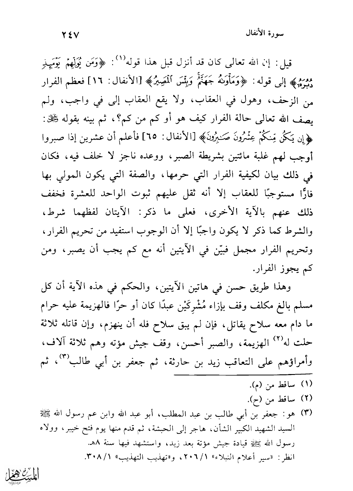 (¬3) هو: جعفر بن أبي طالب بن عبد المطلب، أبو عبد الله وابن عم رسول الله - صلى الله عليه وسلم - السيد الشهيد الكبير الشأن، هاجر إلى الحبشة، ثم قدم منها يوم فتح خيبر، وولاه رسول الله - صلى الله عليه وسلم - قيادة جيش مؤتة بعد زيد، واستشهد فيها سنة 8 هـ.
