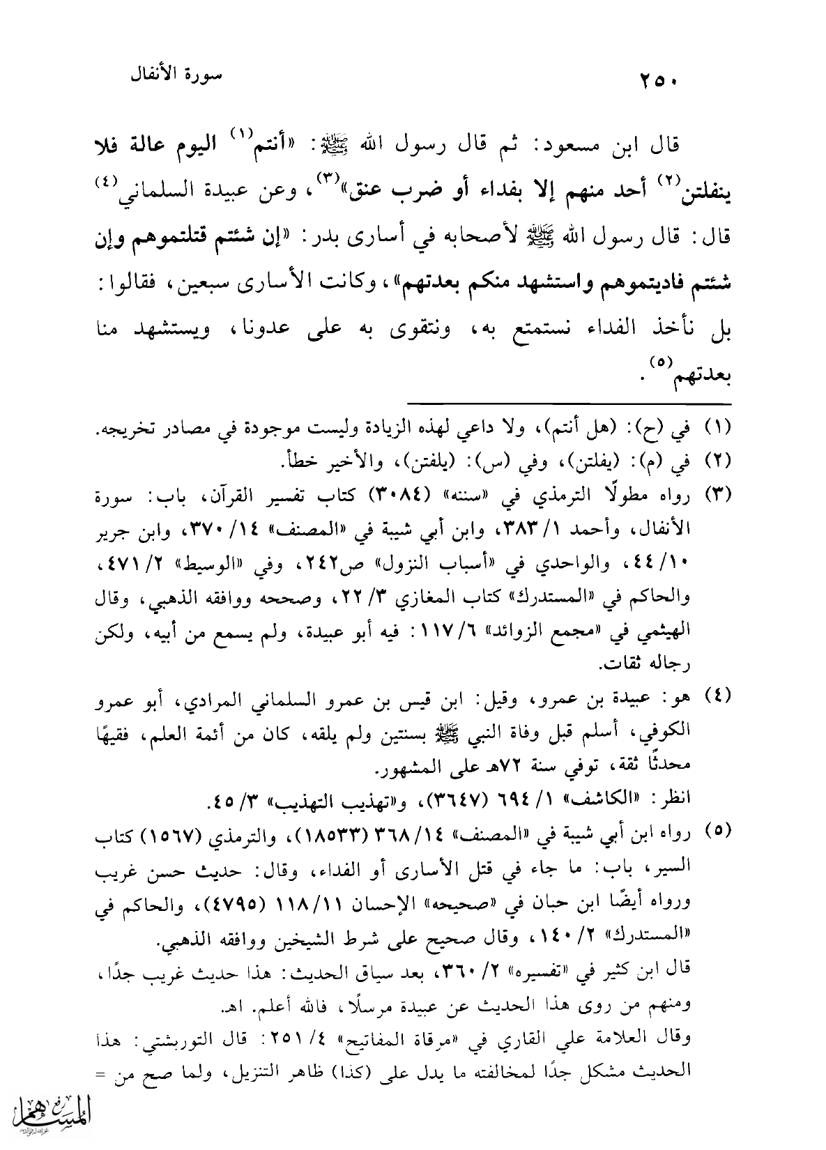 (¬3) رواه مطولًا الترمذي في "سننه" (3084) كتاب تفسير القرآن، باب: سورة الأنفال، وأحمد 1/ 383، وابن أبي شيبة في "المصنف" 14/ 370، وابن جرير 10/ 44، والواحدي في "أسباب النزول" ص 242، وفي "الوسيط" 2/ 471، والحاكم في "المستدرك" كتاب المغازي 3/ 22، وصححه ووافقه الذهبي، وقال الهيثمي في "مجمع الزوائد" 6/ 117: فيه أبو عبيدة، ولم يسمع من أبيه، ولكن رجاله ثقات.