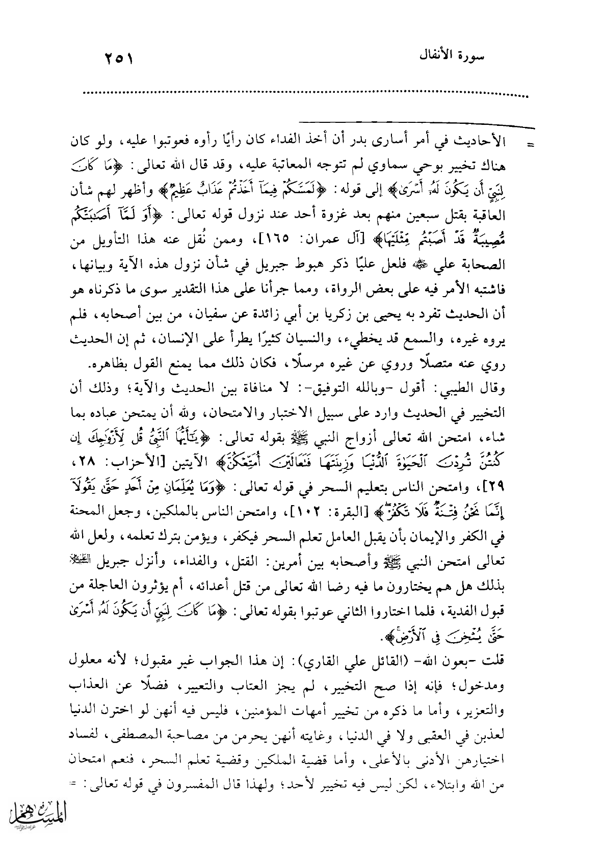 = الأحاديث في أمر أسارى بدر أن أخذ الفداء كان رأيًا رأوه فعوتبوا عليه، ولو كان هناك تخيير بوحي سماوي لم تتوجه المعاتبة عليه، وقد قال الله تعالى: {مَا كَانَ لِنَبِيٍّ أَنْ يَكُونَ لَهُ أَسْرَى} إلى قوله: {لَمَسَّكُمْ فِيمَا أَخَذْتُمْ عَذَابٌ عَظِيمٌ} وأظهر لهم شأن العاقبة بقتل سبعين منهم بعد غزوة أحد عند نزول قوله تعالى: {أَوَلَمَّا أَصَابَتْكُمْ مُصِيبَةٌ قَدْ أَصَبْتُمْ مِثْلَيْهَا} [آل عمران: 165]، وممن نقل عنه هذا التأويل من الصحابة علي -رضي الله عنه- فلعل عليًا ذكر هبوط جبريل في شأن نزول هذه الآية وبيانها، فاشتبه الأمر فيه على بعض الرواة، ومما جرأنا على هذا التقدير سوى ما ذكرناه هو أن الحديث تفرد به يحيى بن زكريا بن أبي زائدة عن سفيان، من بين أصحابه، فلم يروه غيره، والسمع قد يخطئ، والنسيان كثيرًا يطرأ على الإنسان، ثم إن الحديث روي عنه متصلًا وروي عن غيره مرسلاً، فكان ذلك بما يمنع القول بظاهره.