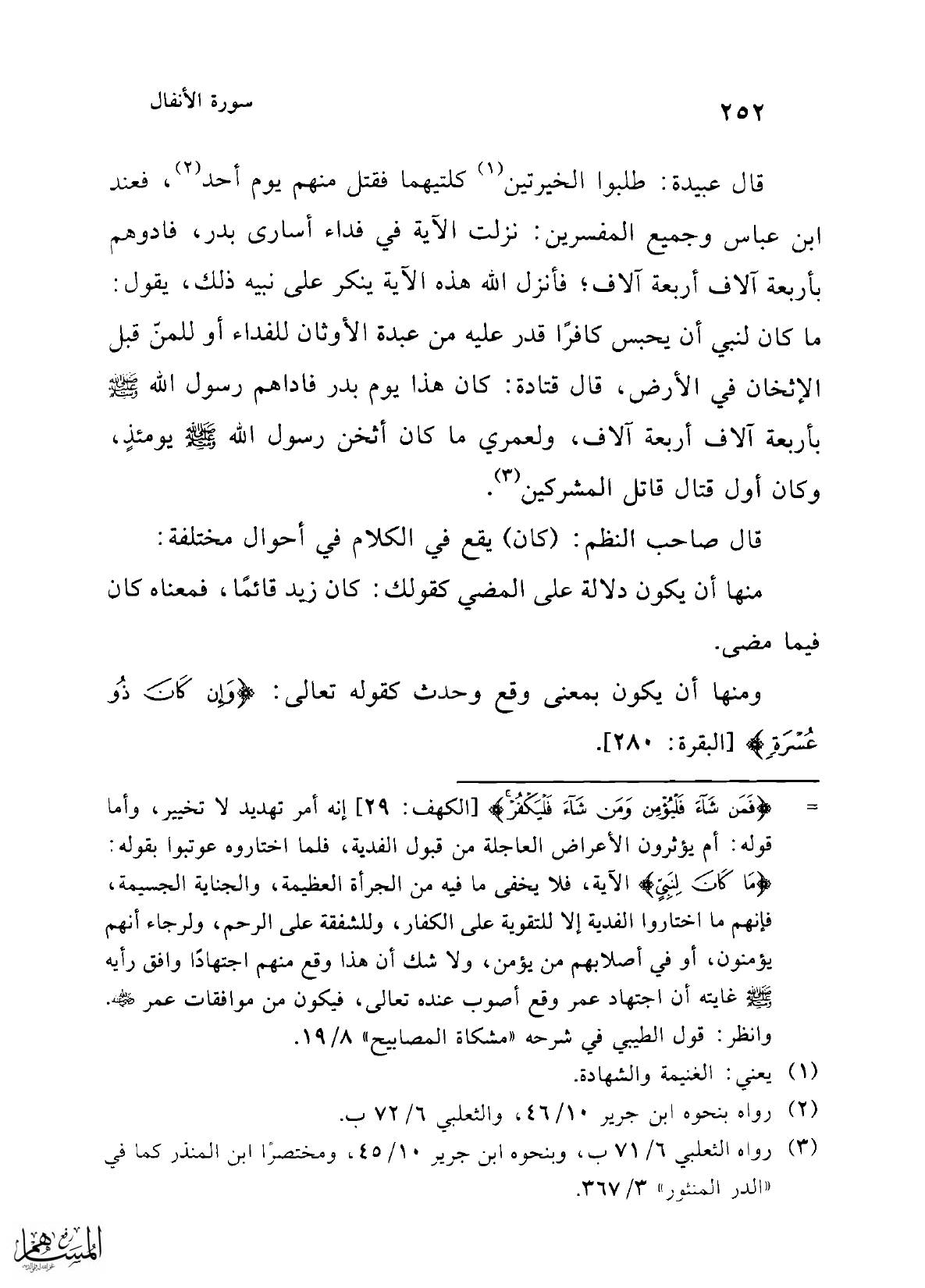 = {فَمَنْ شَاءَ فَلْيُؤْمِنْ وَمَنْ شَاءَ فَلْيَكْفُرْ} [الكهف: 29] إنه أمر تهديد لا تخيير، وأما قوله: أم يؤثرون الأعراض العاجلة من قبول الفدية، فلما اختاروه عوتبوا بقوله: {مَا كَانَ لِنَبِيٍّ} الآية، فلا يخفى ما فيه من الجرأة العظيمة، والجناية الجسيمة، فإنهم ما اختاروا الفدية إلا للتقوية على الكفار، وللشفقة على الرحم، ولرجاء أنهم يؤمنون، أو في أصلابهم من يؤمن، ولا شك أن هذا وقع منهم اجتهادًا وافق رأيه - صلى الله عليه وسلم - غايته أن اجتهاد عمر وقع أصوب عنده تعالى، فيكون من موافقات عمر -رضي الله عنه-. وانظر: قول الطيبي في شرحه "مشكاة المصابيح" 8/ 19.