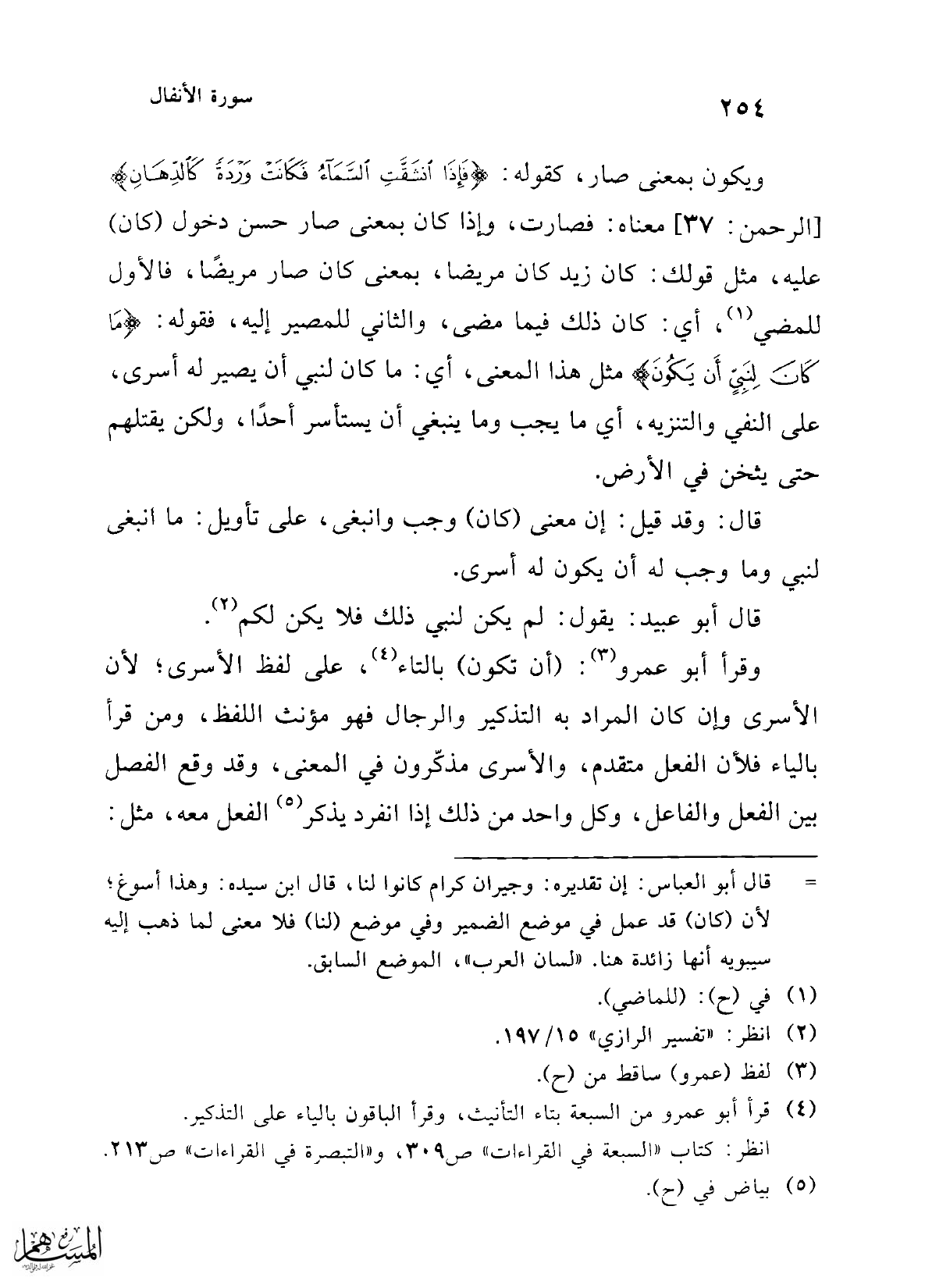 ويكون بمعنى صار، كقوله: {فَإِذَا انْشَقَّتِ السَّمَاءُ فَكَانَتْ وَرْدَةً كَالدِّهَانِ} [الرحمن: 37] معناه: فصارت، وإذا كان بمعنى صار حسن دخول (كان) عليه، مثل قولك: كان زيد كان مريضا، بمعنى كان صار مريضًا، فالأول للمضي (¬1)، أي: كان ذلك فيما مضى، والثاني للمصير إليه، فقوله: {مَا كَانَ لِنَبِيٍّ أَنْ يَكُونَ} مثل هذا المعنى، أي: ما كان لنبي أن يصير له أسرى، على النفي والتنزيه، أي ما يجب وما ينبغي أن يستأسر أحدًا، ولكن يقتلهم حتى يثخن في الأرض.