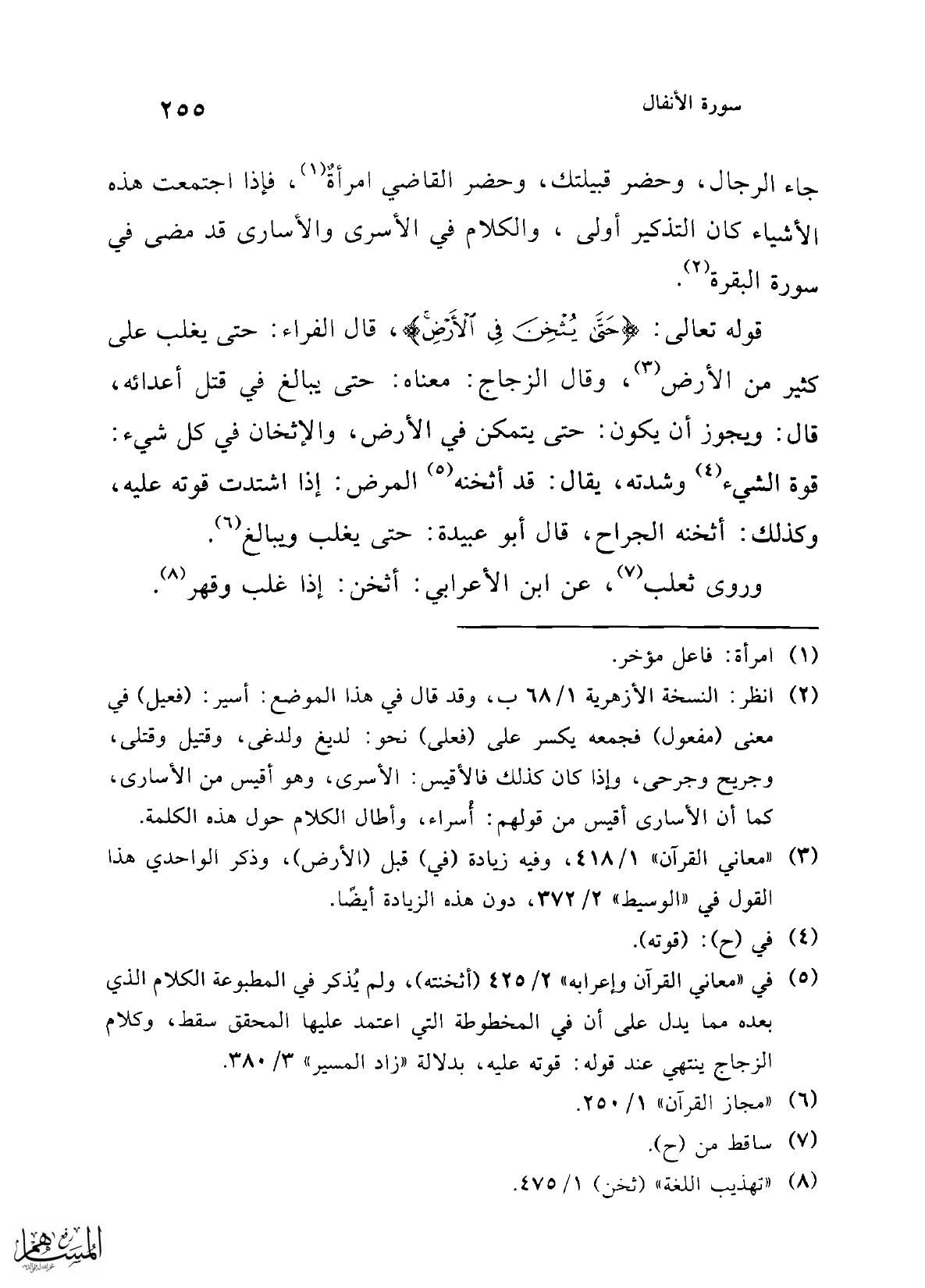 (¬5) في "معاني القرآن وإعرابه" 2/ 425 (أثخنته)، ولم يُذكر في المطبوعة الكلام الذي بعده مما يدل على أن في المخطوطة التي اعتمد عليها المحقق سقط، وكلام الزجاج ينتهي عند قوله: قوته عليه، بدلالة "زاد المسير" 3/ 380.