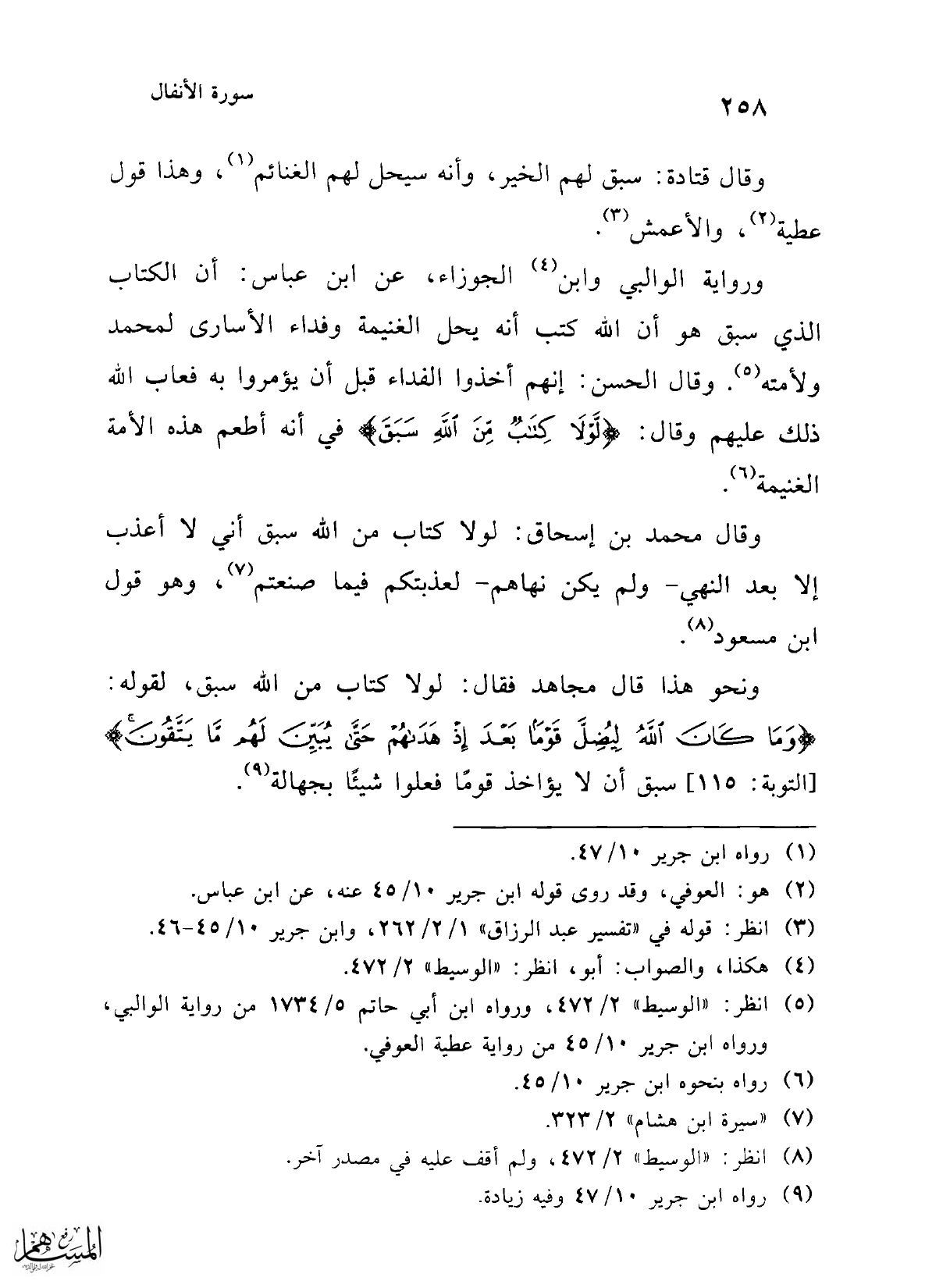 (¬5) انظر: "الوسيط" 2/ 472، ورواه ابن أبي حاتم 5/ 1734 من رواية الوالبي، ورواه ابن جرير 10/ 45 من رواية عطية العوفي.