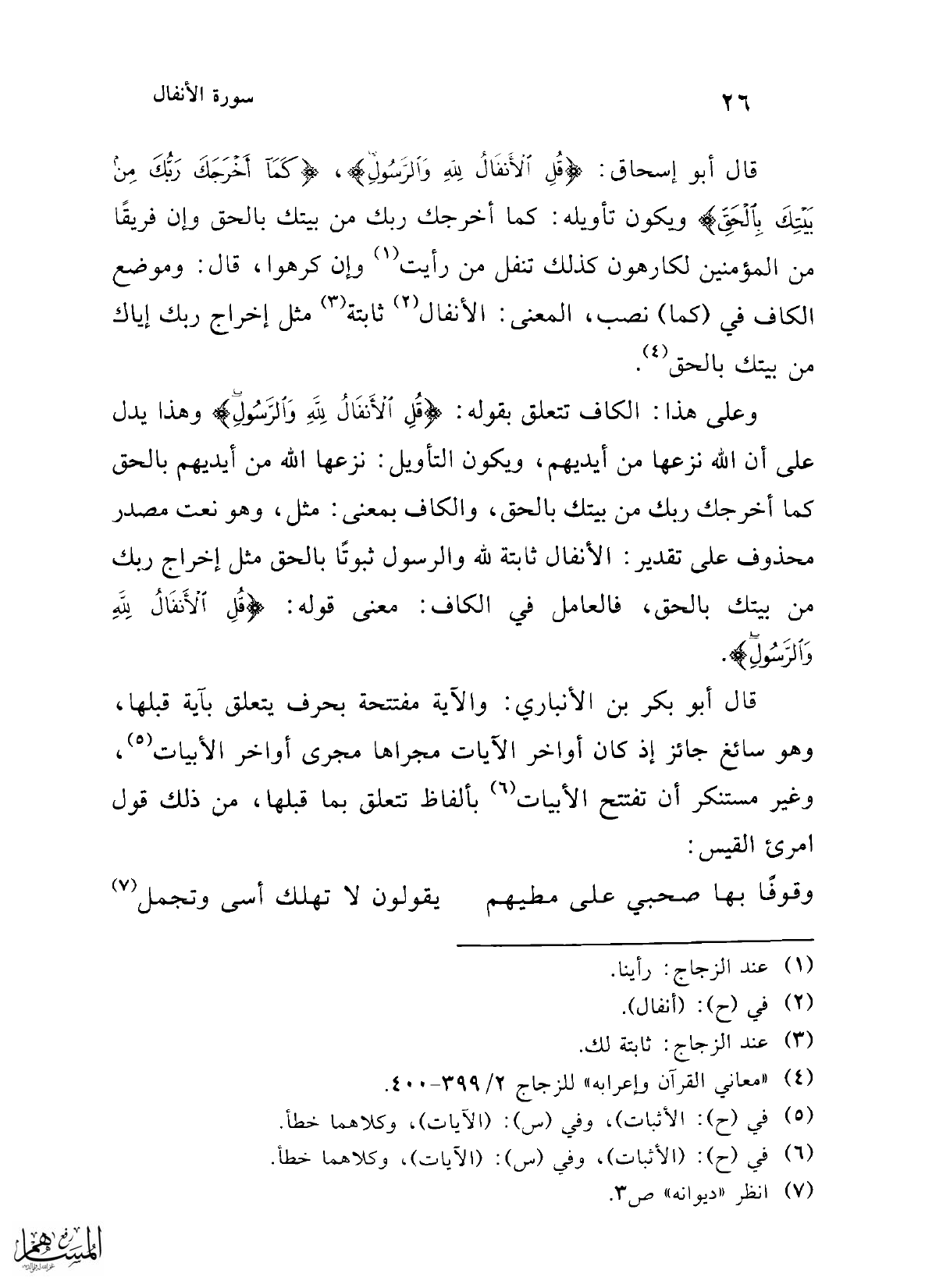 قال أبو إسحاق: {قُلِ الْأَنْفَالُ لِلَّهِ وَالرَّسُولِ}، {كَمَا أَخْرَجَكَ رَبُّكَ مِنْ بَيْتِكَ بِالْحَقِّ} ويكون تأويله: كما أخرجك ربك من بيتك بالحق وإن فريقًا من المؤمنين لكارهون كذلك تنفل من رأيت (¬1) وإن كرهوا، قال: وموضع الكاف في (كما) نصب، المعنى: الأنفال (¬2) ثابتة (¬3) مثل إخراج ربك إياك من بيتك بالحق (¬4).