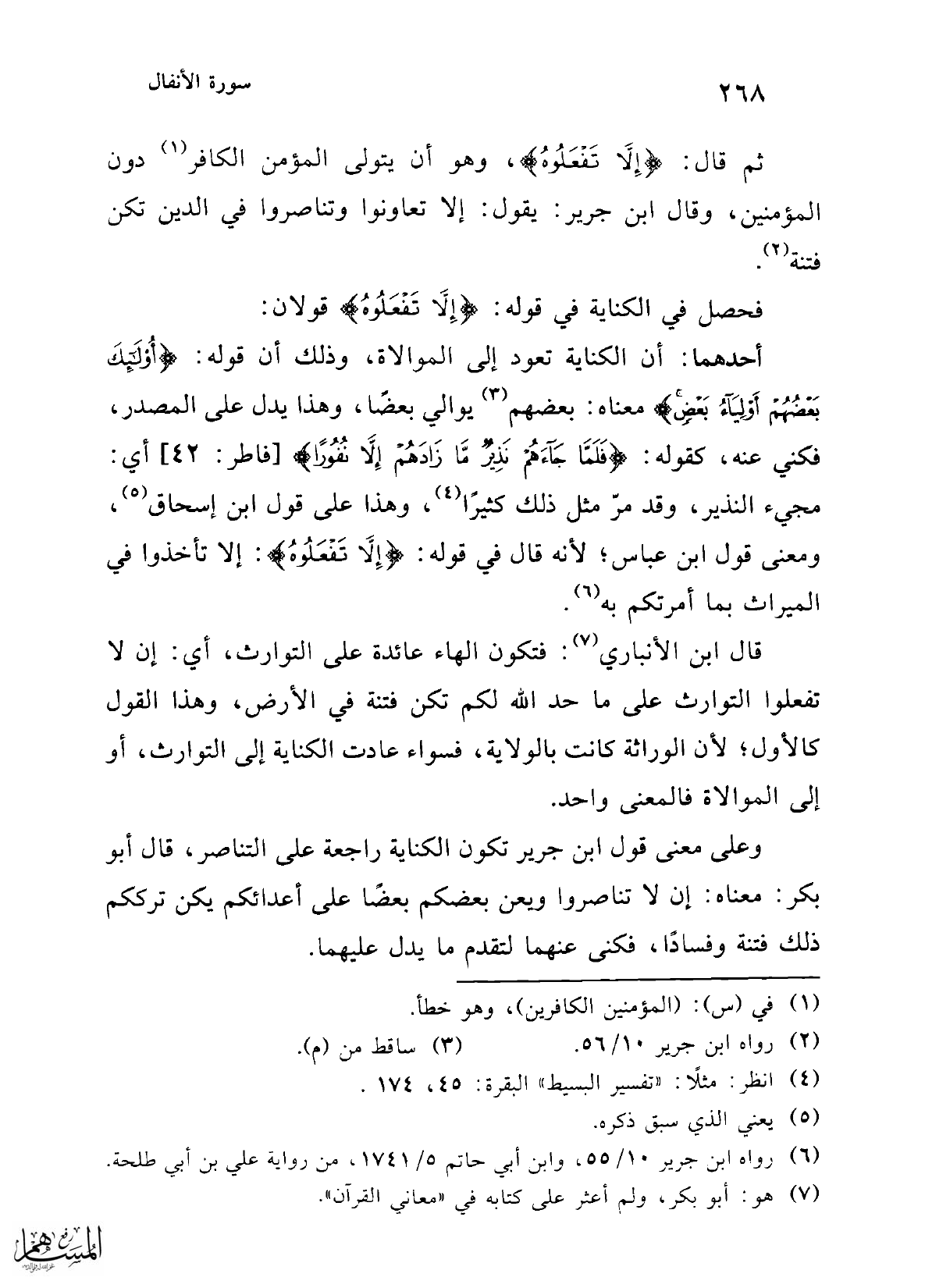 وعلى معنى قول ابن جرير تكون الكناية راجعة على التناصر، قال أبو بكر: معناه: إن لا تناصروا ويعن بعضكم بعضًا على أعدائكم يكن ترككم ذلك فتنة وفسادًا، فكنى عنهما لتقدم ما يدل عليهما.