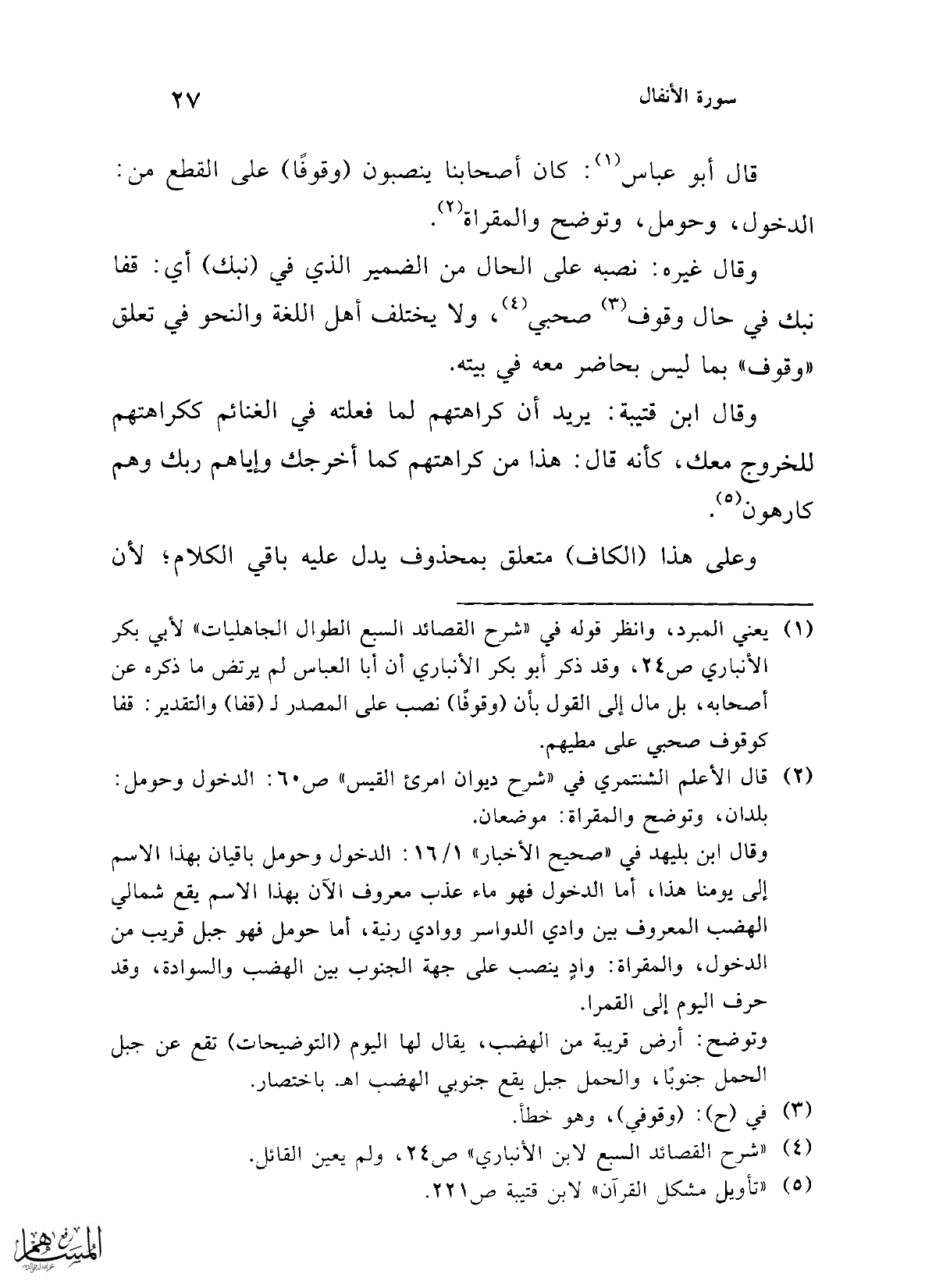 (¬1) يعني المبرد، وانظر قوله في "شرح القصائد السبع الطوال الجاهليات" لأبي بكر الأنباري ص 24، وقد ذكر أبو بكر الأنباري أن أبا العباس لم يرتض ما ذكره عن أصحابه، بل مال إلى القول بأن (وقوفًا) نصب على المصدر و (قفا) والتقدير: قفا كوقوف صحبي على مطيهم.