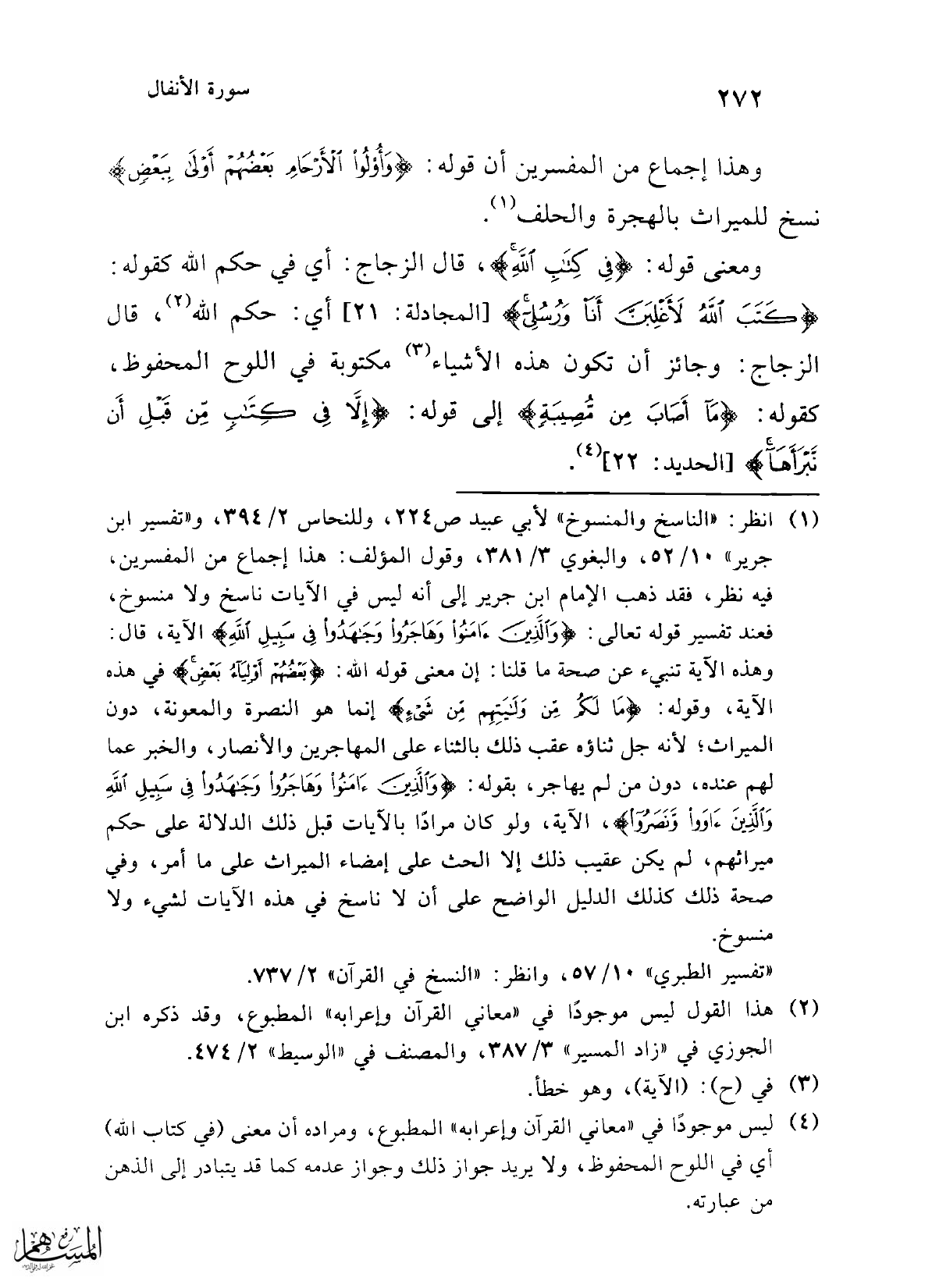 (¬4) ليس موجودًا في "معاني القرآن وإعرابه" المطبوع، ومراده أن معنى (في كتاب الله) أي في اللوح المحفوظ، ولا يريد جواز ذلك وجواز عدمه كما قد يتبادر إلى الذهن من عبارته.