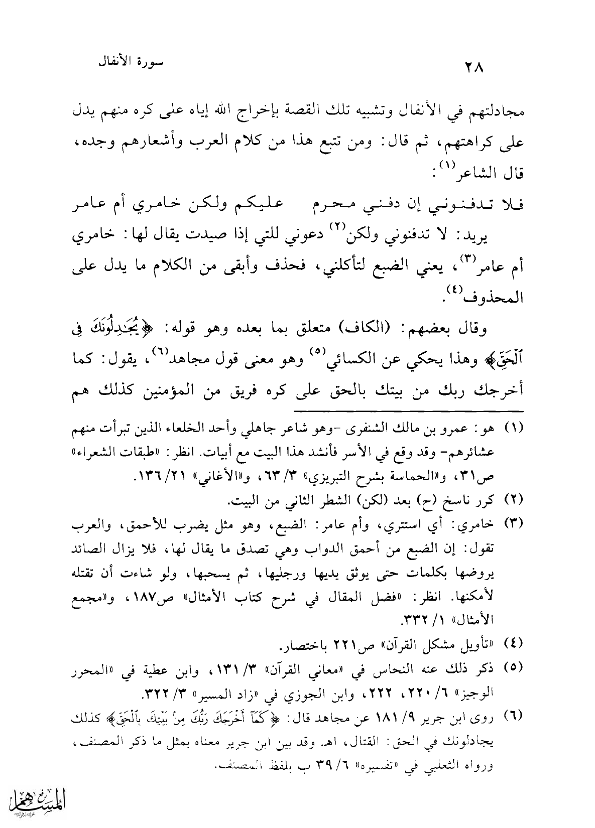 مجادلتهم في الأنفال وتشبيه تلك القصة بإخراج الله إياه على كره منهم يدل على كراهتهم، ثم قال: ومن تتبع هذا من كلام العرب وأشعارهم وجده، قال الشاعر (¬1):