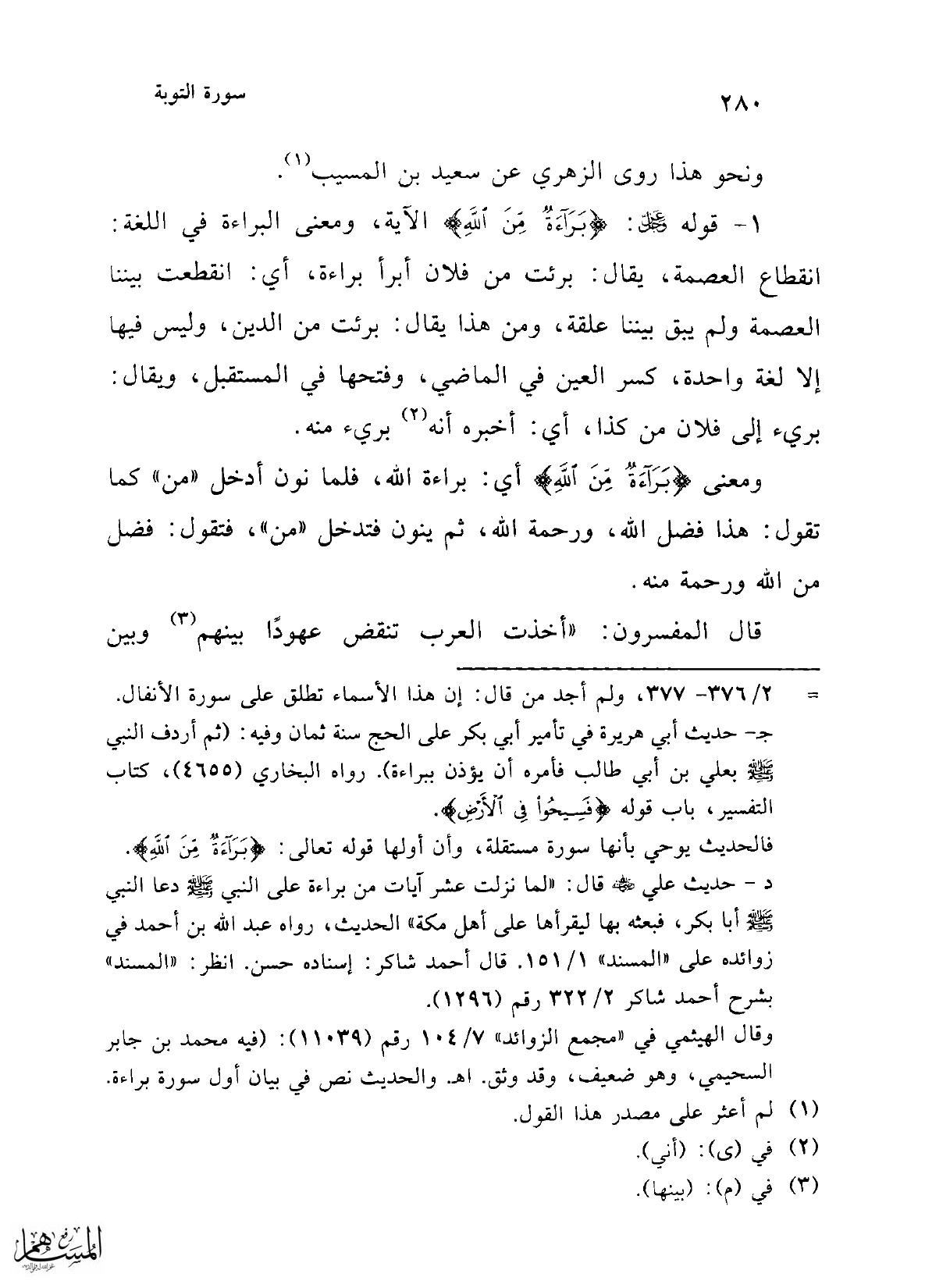 1 - قوله -عز وجل-: {بَرَاءَةٌ مِنَ اللَّهِ وَرَسُولِهِ} الآية، ومعى البراءة في اللغة: انقطاع العصمة، يقال: برئت من فلان أبرأ براءة، أي: انقطعت بيننا العصمة ولم يبق بيننا علقة، ومن هذا يقال: برئت من الدين، وليس فيها إلا لغة واحدة، كسر العين في الماضي، وفتحها في المستقبل، ويقال: بريء إلى فلان من كذا، أي: أخبره أنه (¬2) بريء منه.