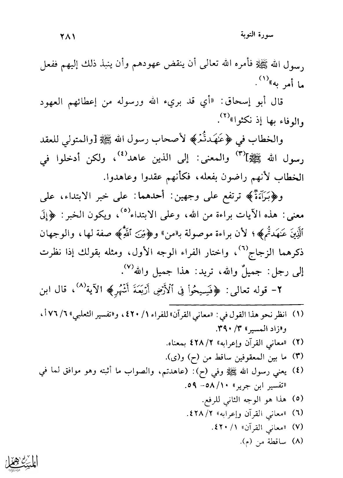 و {بَرَاءَةٌ} ترتفع على وجهين: أحدهما: على خبر الابتداء، على معنى: هذه الآيات براءة من الله، وعلى الابتداء (¬5)، ويكون الخبر: {إِلَى الَّذِينَ عَاهَدْتُمْ}؛ لأن براءة موصولة بـ"من" و {مِنَ اللَّهِ} صفة لها، والوجهان ذكرهما الزجاج (¬6)، واختار الفراء الوجه الأول، ومثله بقولك إذا نظرت إلى رجل: جميلٌ والله، تريد: هذا جميل والله (¬7).