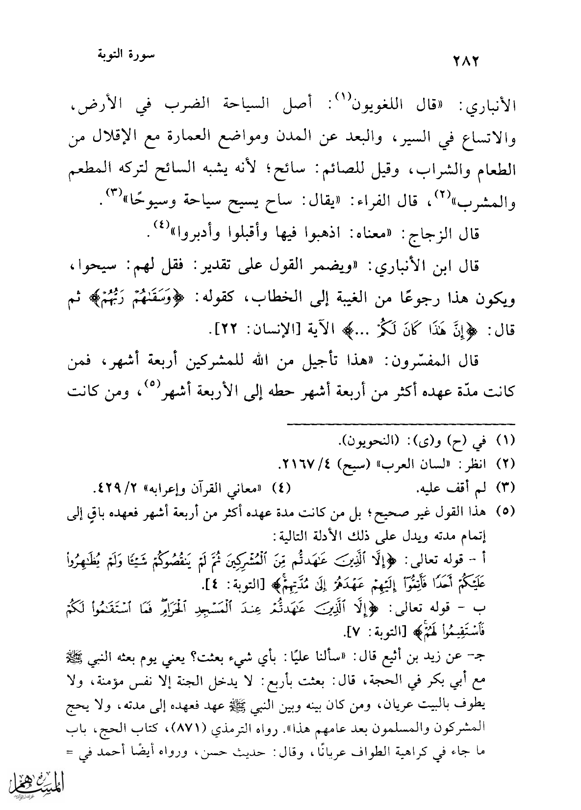قال المفسّرون: "هذا تأجيل من الله للمشركين أربعة أشهر، فمن كانت مدّة عهده أكثر من أربعة أشهر حطه إلى الأربعة أشهر (¬5)، ومن كانت
