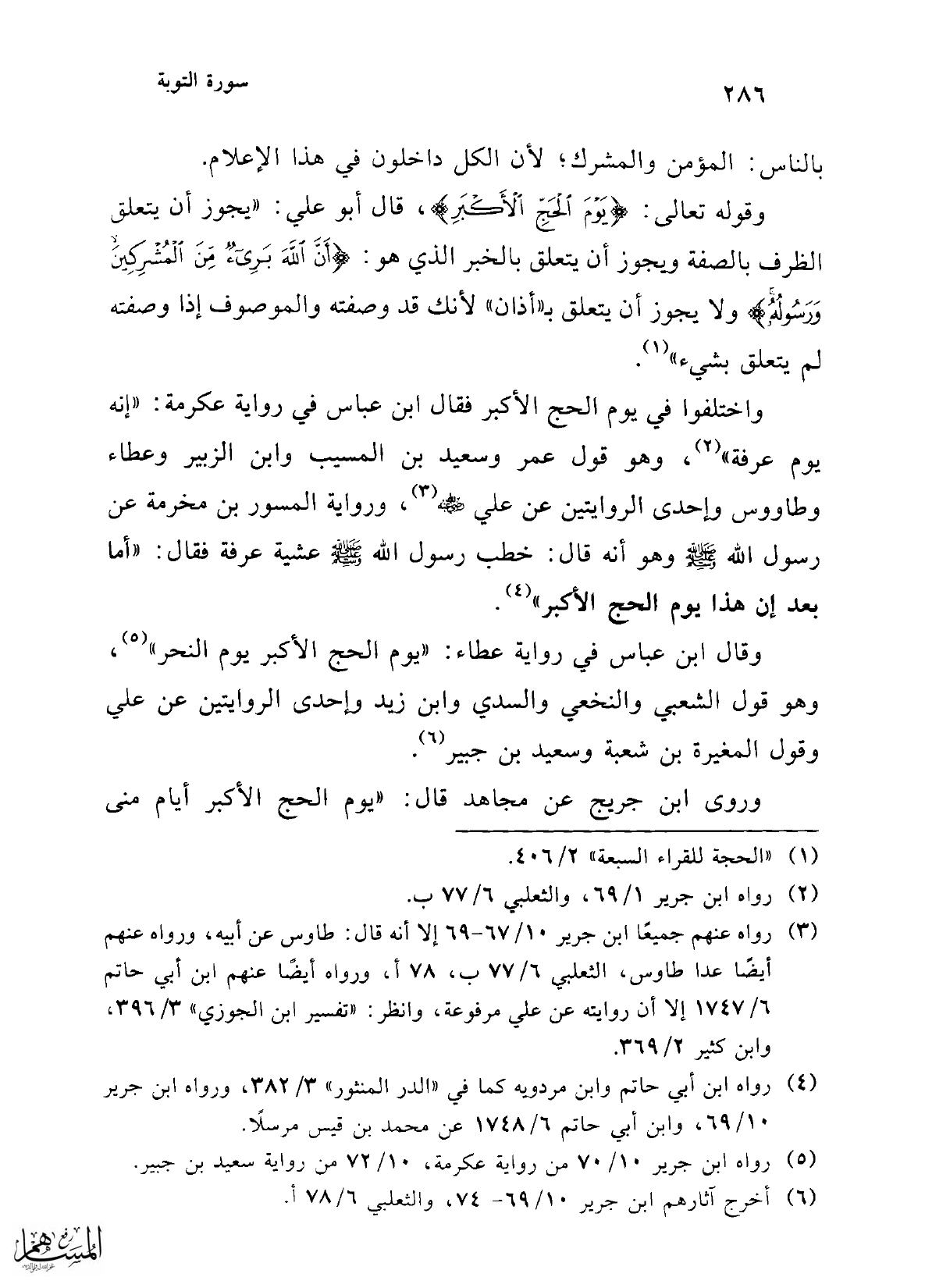 واختلفوا في يوم الحج الأكبر فقال ابن عباس في رواية عكرمة: "إنه يوم عرفة" (¬2)، وهو قول عمر وسعيد بن المسيب وابن الزبير وعطاء وطاووس وإحدى الروايتين عن علي -رضي الله عنه- (¬3)، ورواية المسور بن مخرمة عن رسول الله - صلى الله عليه وسلم - وهو أنه قال: خطب رسول الله - صلى الله عليه وسلم - عشية عرفة فقال: "أما بعد إن هذا يوم الحج الاكبر" (¬4).