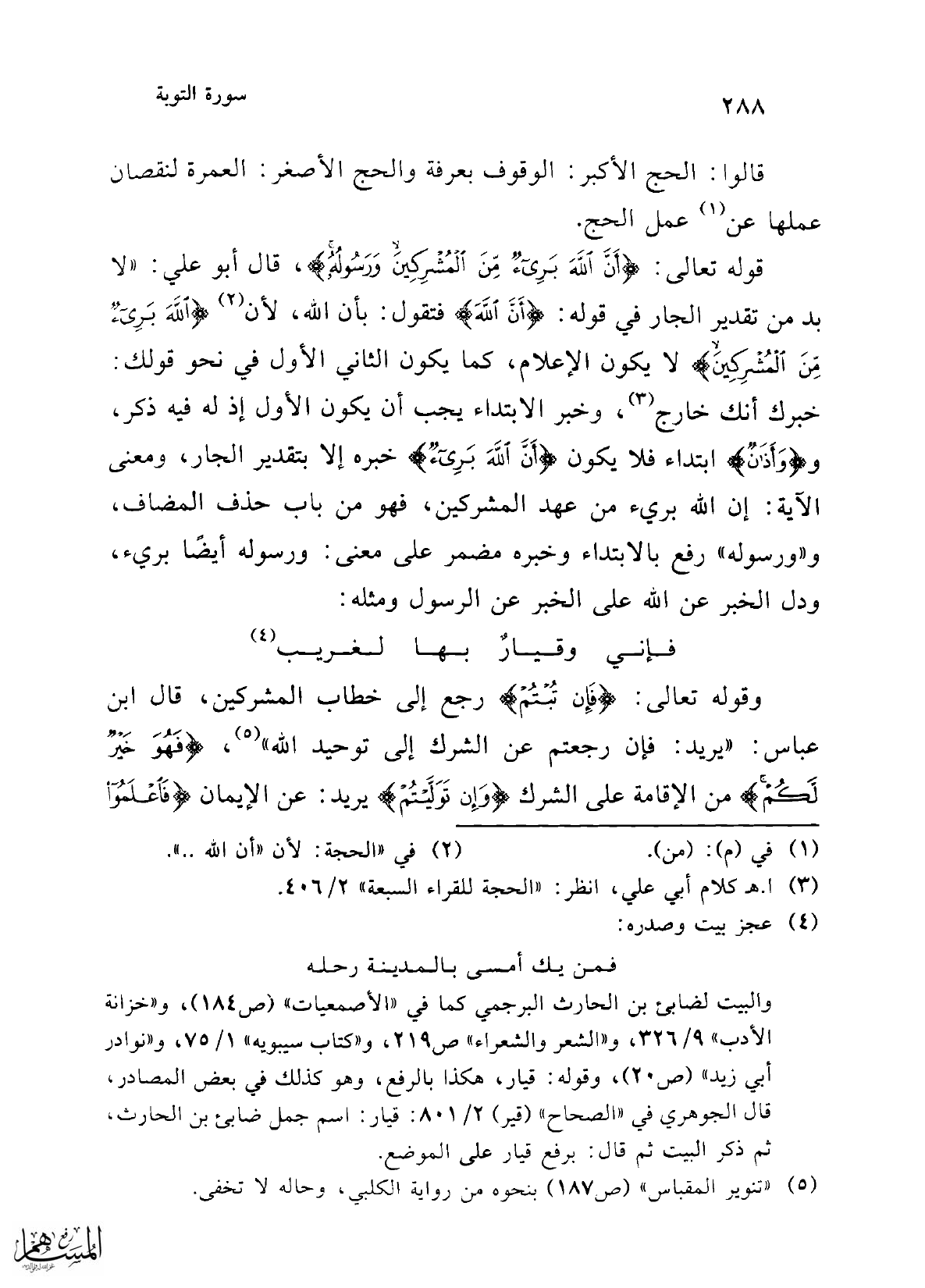 قوله تعالى: {أَنَّ اللَّهَ بَرِيءٌ مِنَ الْمُشْرِكِينَ وَرَسُولُهُ}، قال أبو علي: "لا بد من تقدير الجار في قوله {أَنَّ اللَّهَ} فتقول: بأن الله، لأن (¬2) {اللَّهَ بَرِيءٌ مِنَ الْمُشْرِكِينَ} لا يكون الإعلام، كما يكون الثاني الأول في نحو قولك: خبرك أنك خارج (¬3)، وخبر الابتداء يجب أن يكون الأول إذ له فيه ذكر، و {وَأَذَانٌ} ابتداء فلا يكون {أَنَّ اللَّهَ بَرِيءٌ} خبره إلا بتقدير الجار، ومعنى الآية: إن الله بريء من عهد المشركين، فهو من باب حذف المضاف، و"ورسوله" رفع بالابتداء وخبره مضمر على معنى: ورسوله أيضاً بريء، ودل الخبر عن الله على الخبر عن الرسول ومثله.