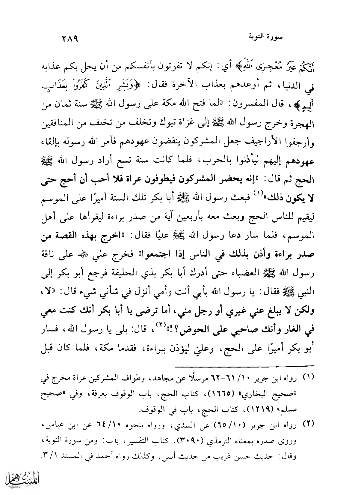 أَنَّكُمْ غَيْرُ مُعْجِزِي اللَّهِ} أي: إنكم لا تفوتون بأنفسكم من أن يحل بكم عذابه في الدنيا، ثم أوعدهم بعذاب الآخرة فقال: {وَبَشِّرِ الَّذِينَ كَفَرُوا بِعَذَابٍ أَلِيمٍ}، قال المفسرون: "لما فتح الله مكة على رسول الله -صلى الله عليه وسلم- سنة ثمان من الهجرة وخرج رسول الله -صلى الله عليه وسلم- إلى غزاة تبوك وتخلف من تخلف من المنافقين وأرجفوا الأراجيف جعل المشركون ينقضون عهودهم فأمر الله رسوله بإلقاء عهودهم إليهم ليأذنوا بالحرب، فلما كانت سنة تسع أراد رسول الله -صلى الله عليه وسلم- الحج ثم قال: "إنه يحضر المشركون فيطوفون عراة فلا أحب أن أحج حتى لا يكون ذلك" (¬1) فبعث رسول الله -صلى الله عليه وسلم- أبا بكر تلك السنة أميرًا على الموسم ليقيم للناس الحج وبعث معه بأربعين آية من صدر براءة ليقرأها على أهل الموسم، فلما سار دعا رسول الله -صلى الله عليه وسلم- عليًا فقال: "اخرج بهذه القصة من صدر براءة وأذن بذلك فى الناس إذا اجتمعوا" فخرج علي -رضي الله عنه- على ناقة رسول الله -صلى الله عليه وسلم- العضباء حتى أدرك أبا بكر بذي الحليفة فرجع أبو بكر إلى النبي -صلى الله عليه وسلم- فقال: يا رسول الله بأبي أنت وأمي أنزل في شأني شيء قال: "لا، ولكن لا يبلغ عني غيري أو رجل مني، أما ترضى يا أبا بكر أنك كنت معي في الغار وأنك صاحبي على الحوض؟! " (¬2)، قال: بلى يا رسول الله، فسار أبو بكر أميرًا على الحج، وعليّ ليؤذن ببراءة، فقدما مكة، فلما كان قبل