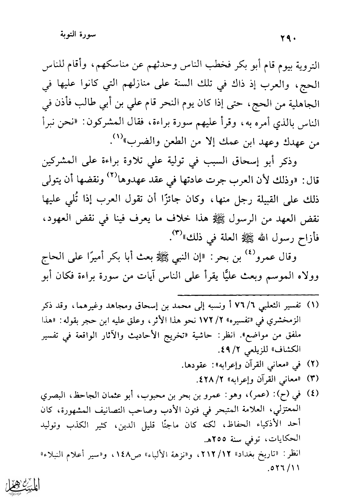 وذكر أبو إسحاق السبب في تولية علي تلاوة براءة على المشركين قال: "وذلك لأن العرب جرت عادتها في عقد عهدوها (¬2) ونقضها أن يتولى ذلك على القبيلة رجل منها، وكان جائزًا أن تقول العرب إذا تُلي عليها نقض العهد من الرسول - صلى الله عليه وسلم - هذا خلاف ما يعرف فينا في نقض العهود، فأزاح رسول الله -صلى الله عليه وسلم- العلة في ذلك" (¬3).