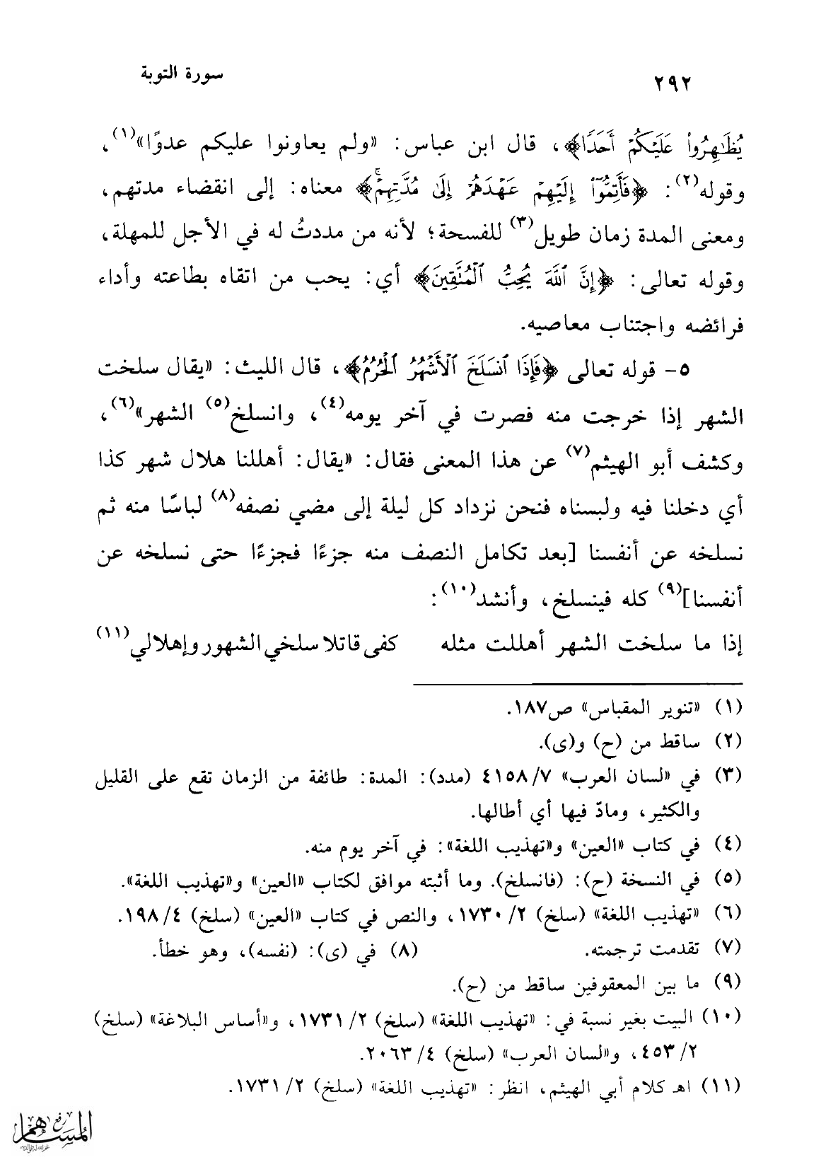 5 - قوله تعالى {فَإِذَا انْسَلَخَ الْأَشْهُرُ الْحُرُمُ}، قال الليث: "يقال سلخت الشهر إذا خرجت منه فصرت في آخر يومه (¬4)، وانسلخ (¬5) الشهر" (¬6)، وكشف أبو الهيثم (¬7) عن هذا المعنى فقال: "يقال: أهللنا هلال شهر كذا أي دخلنا فيه ولبسناه فنحن نزداد كل ليلة إلى مضي نصفه (¬8) لباسًا منه ثم نسلخه عن أنفسنا [بعد تكامل النصف منه جزءًا فجزءًا حتى نسلخه عن أنفسنا] (¬9) كله فينسلخ، وأنشد (¬10):