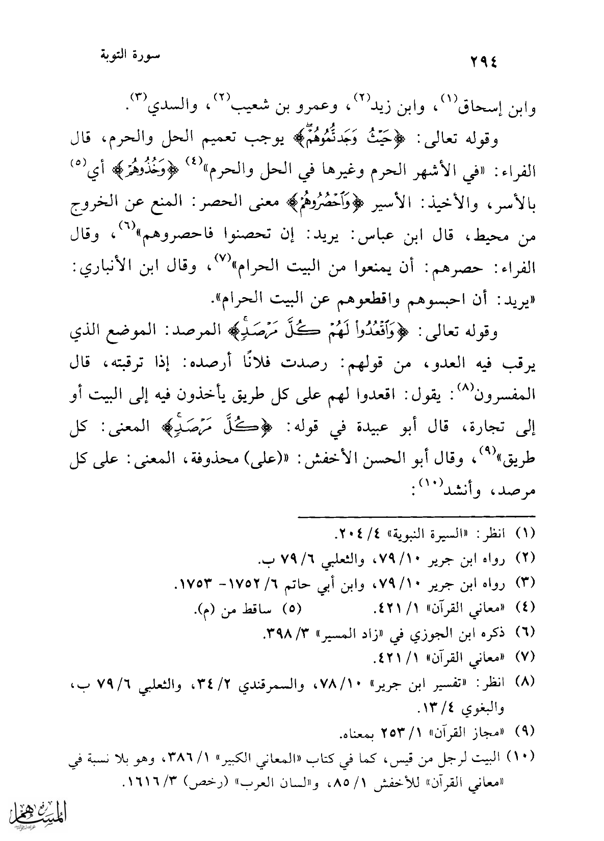 وقوله تعالى: {وَاقْعُدُوا لَهُمْ كُلَّ مَرْصَدٍ} المرصد: الموضع الذي يرقب فيه العدو، من قولهم: رصدت فلانًا أرصده: إذا ترقبته، قال المفسرون (8): يقول: اقعدوا لهم على كل طريق يأخذون فيه إلى البيت أو إلى تجارة، قال أبو عبيدة في قوله: {كُلَّ مَرْصَدٍ} المعنى: كل طريق" (9)، وقال أبو الحسن الأخفش: " (على) محذوفة، المعنى: على كل مرصد، وأنشد (10):