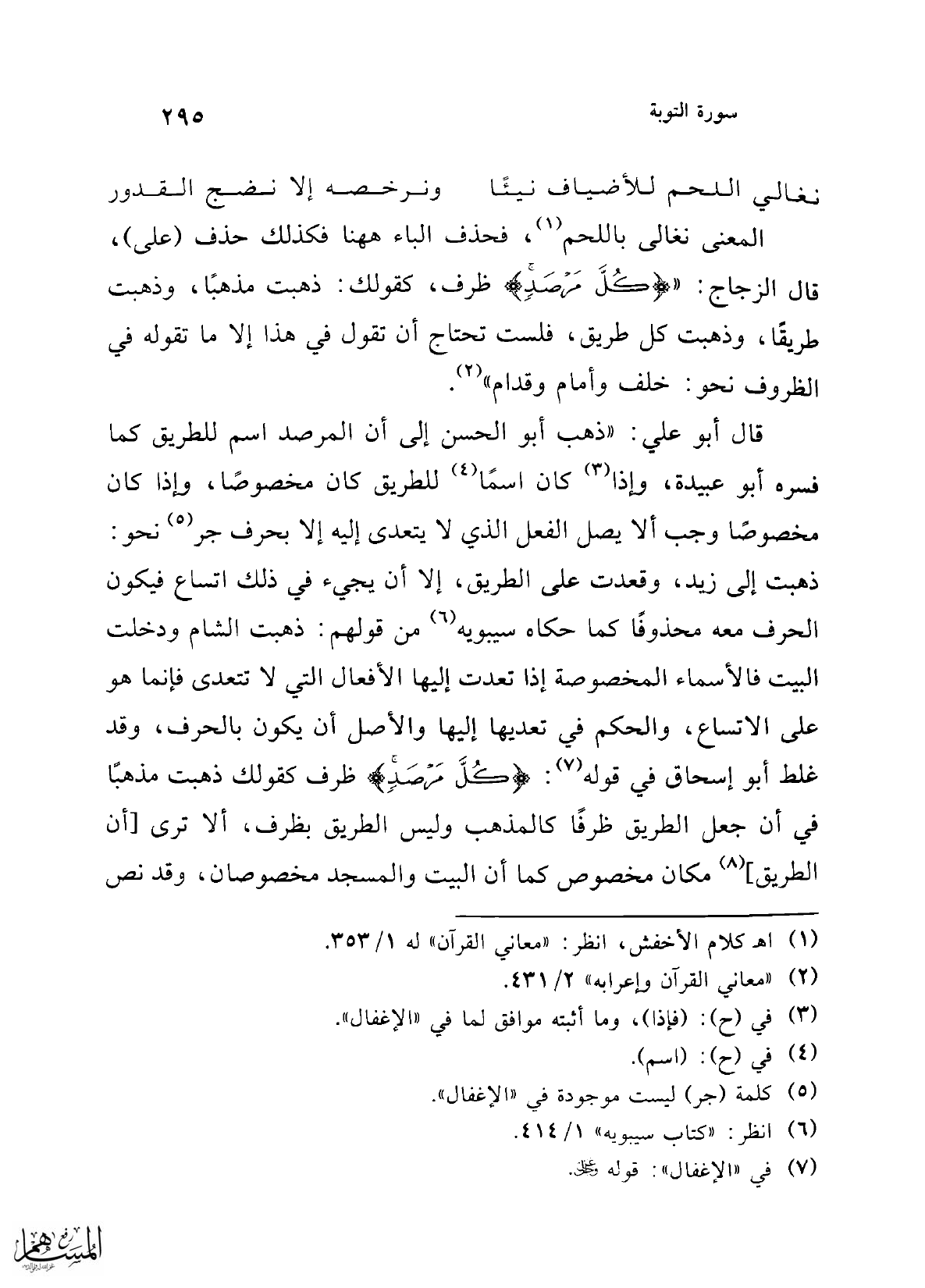 قال أبو علي: "ذهب أبو الحسن إلى أن المرصد اسم للطريق كما فسره أبو عبيدة، وإذا (¬3) كان اسمًا (¬4) للطريق كان مخصوصًا، وإذا كان مخصوصًا وجب ألا يصل الفعل الذي لا يتعدى إليه إلا بحرف جر (¬5) نحو: ذهبت إلى زيد، وقعدت على الطريق، إلا أن يجيء في ذلك اتساع فيكون الحرف معه محذوفًا كما حكاه سيبويه (¬6) من قولهم: ذهبت الشام ودخلت البيت فالأسماء المخصوصة إذا تعدت إليها الأفعال التي لا تتعدى فإنما هو على الاتساع، والحكم في تعديها إليها والأصل أن يكون بالحرف، وقد غلط أبو إسحاق في قوله (¬7): {كُلَّ مَرْصَدٍ} ظرف كقولك ذهبت مذهبًا في أن جعل الطريق ظرفًا كالمذهب وليس الطريق بظرف، ألا ترى [أن الطريق] (¬8) مكان مخصوص كما أن البيت والمسجد مخصوصان، وقد نص