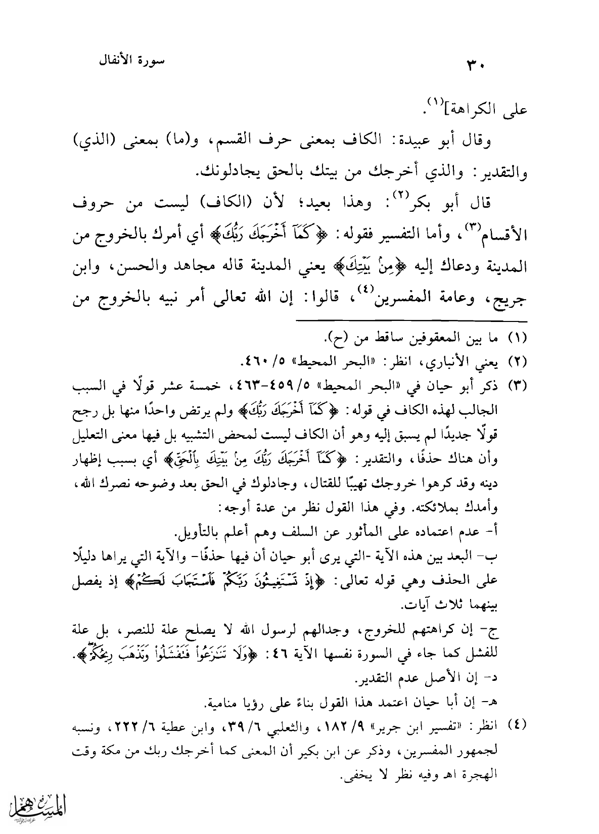(¬3) ذكر أبو حيان في "البحر المحيط" 5/ 459 - 463، خمسة عشر قولًا في السبب الجالب لهذه الكاف في قوله: {كَمَا أَخْرَجَكَ رَبُّكَ} ولم يرتض واحدًا منها بل رجح قولًا جديدًا لم يسبق إليه وهو أن الكاف ليست لمحض التشبيه بل فيها معنى التعليل وأن هناك حذفًا، والتقدير: {كَمَا أَخْرَجَكَ رَبُّكَ مِنْ بَيْتِكَ بِالْحَقِّ} أي بسبب إظهار دينه وقد كرهوا خروجك تهيبًا للقتال، وجادلوك في الحق بعد وضوحه نصرك الله، وأمدك بملائكته. وفي هذا القول نظر من عدة أوجه: