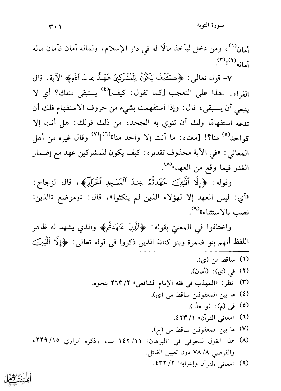 وقوله: {إِلَّا الَّذِينَ عَاهَدْتُمْ عِنْدَ الْمَسْجِدِ الْحَرَامِ}، قال الزجاج: "أي: ليس العهد إلا لهؤلاء الذين لم ينكثوا"، قال: "وموضع "الذين" نصب بالاستثناء" (¬9).