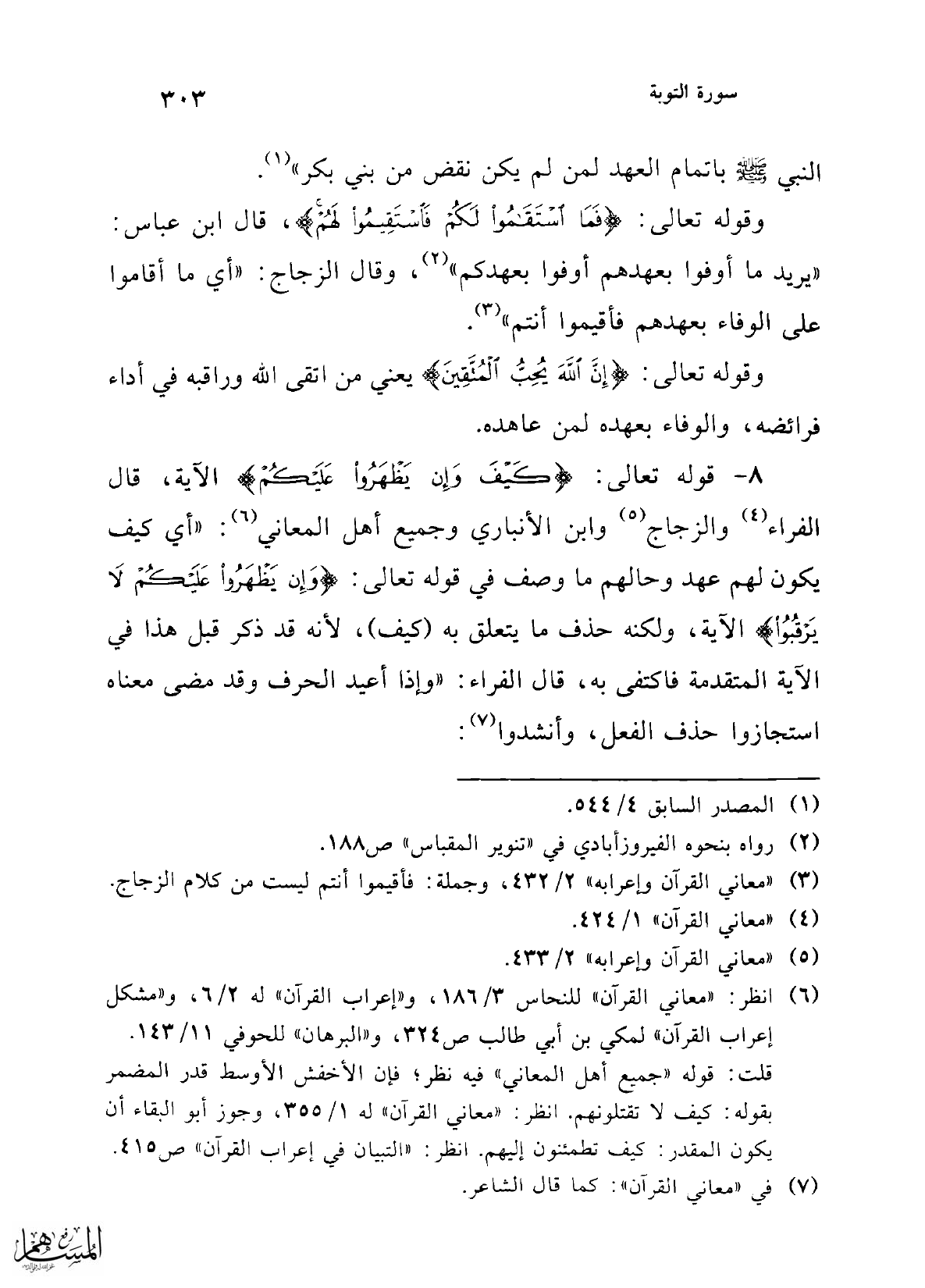 8 - قوله تعالى: {كَيْفَ وَإِنْ يَظْهَرُوا عَلَيْكُمْ} الآية، قال الفراء (¬4) والزجاج (¬5) وابن الأنباري وجميع أهل المعاني (¬6): "أي كيف يكون لهم عهد وحالهم ما وصف في قوله تعالى: {وَإِنْ يَظْهَرُوا عَلَيْكُمْ لَا يَرْقُبُوا} الآية، ولكنه حذف ما يتعلق به (كيف)؛ لأنه قد ذكر قبل هذا في الآية المتقدمة فاكتفى به، قال الفراء: "وإذا أعيد الحرف وقد مضى معناه استجازوا حذف الفعل، وأنشدوا (¬7):