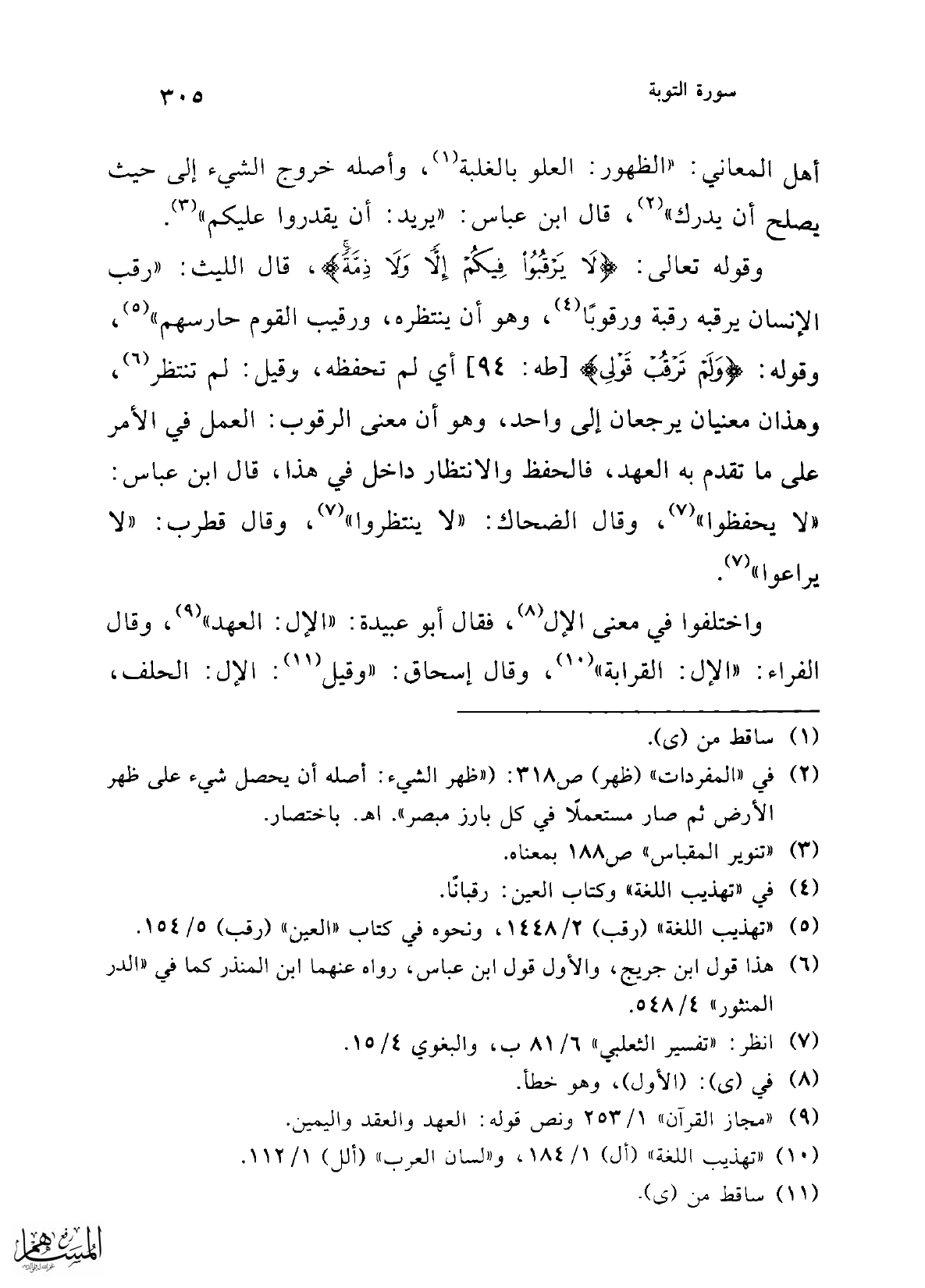 وقوله تعالى: {لَا يَرْقُبُوا فِيكُمْ إِلًّا وَلَا ذِمَّةً}، قال الليث: "رقب الإنسان يرقبه رقبة ورقوبًا (4)، وهو أن ينتظره، ورقيب القوم حارسهم" (5)، وقوله: {وَلَمْ تَرْقُبْ قَوْلِي} [طه: 94] أي لم تحفظه، وقيل: لم تنتظر (6)، وهذان معنيان يرجعان إلى واحد، وهو أن معنى الرقوب: العمل في الأمر على ما تقدم به العهد، فالحفظ والانتظار داخل في هذا، قال ابن عباس: "لا يحفظوا" (7)، وقال الضحاك: "لا ينتظروا" (7)، وقال قطرب: "لا يراعوا" (7).