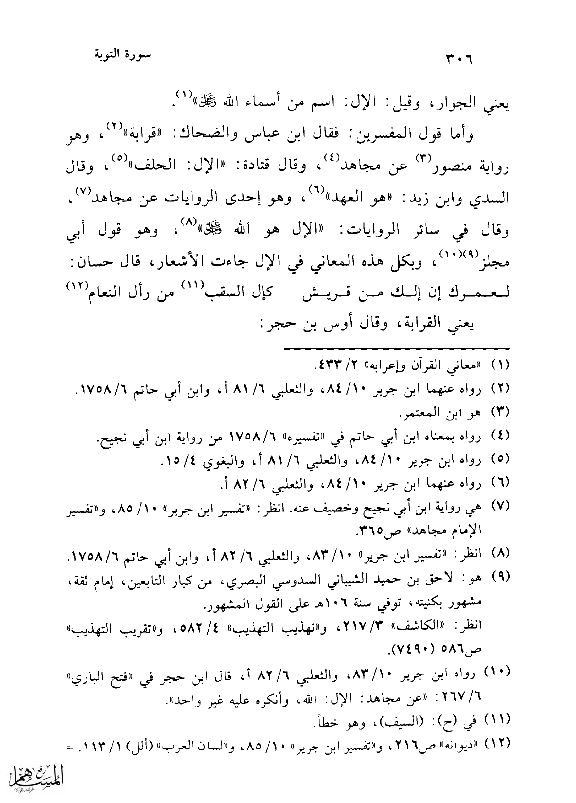 (¬10) رواه ابن جرير 10/ 83، والثعلبي 6/ 82 أ، قال ابن حجر في"فتح الباري" 6/ 267: "عن مجاهد: الإل: الله، وأنكره عليه غير واحد".