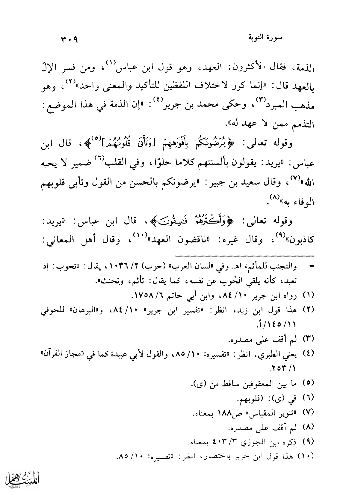 الذمة، فقال الأكثرون: العهد، وهو قول ابن عباس (¬1)، ومن فسر الإلّ بالعهد قال: "إنما كرر لاختلاف اللفظين للتأكيد والمعنى واحد" (¬2)، وهو مذهب المبرد (¬3)، وحكى محمد بن جرير (¬4): "إن الذمة في هذا الموضع: التذمم ممن لا عهد له".