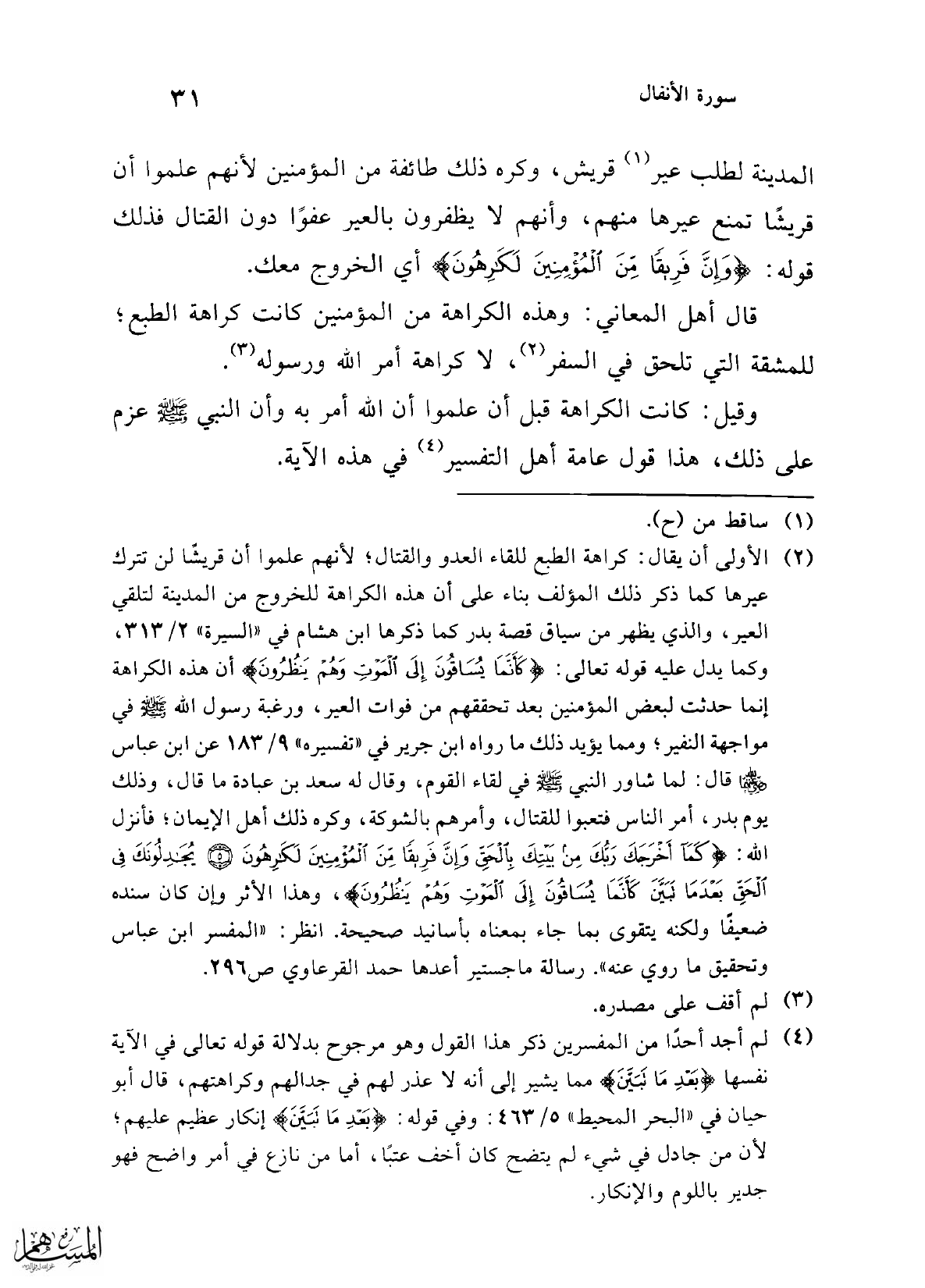 (¬2) الأولى أن يقال: كراهة الطبع للقاء العدو والقتال؛ لأنهم علموا أن قريشًا لن تترك عيرها كما ذكر ذلك المؤلف بناء على أن هذه الكراهة للخروج من المدينة لتلقي العير، والذي يظهر من سياق قصة بدر كما ذكرها ابن هشام في "السيرة" 2/ 313، وكما يدل عليه قوله تعالى: {كَأَنَّمَا يُسَاقُونَ إِلَى الْمَوْتِ وَهُمْ يَنْظُرُونَ} أن هذه الكراهة إنما حدثت لبعض المؤمنين بعد تحققهم من ذوات العير، ورغبة رسول الله - صلى الله عليه وسلم - في مواجهة الفير؛ ومما يؤيد ذلك ما رواه ابن جرير في "تفسيره" 9/ 183 عن ابن عباس - رضي الله عنهما - قال: لما شاور النبي - صلى الله عليه وسلم - في لقاء القوم، وقال له سعد بن عبادة ما قال، وذلك يوم بدر، أمر الناس فتعبوا للقتال، وأمرهم بالشوكة، وكره ذلك أهل الإيمان؛ فأنزل الله: {كَمَا أَخْرَجَكَ رَبُّكَ مِنْ بَيْتِكَ بِالْحَقِّ وَإِنَّ فَرِيقًا مِنَ الْمُؤْمِنِينَ لَكَارِهُونَ (5) يُجَادِلُونَكَ فِي الْحَقِّ بَعْدَمَا تَبَيَّنَ كَأَنَّمَا يُسَاقُونَ إِلَى الْمَوْتِ وَهُمْ يَنْظُرُونَ}، وهذا الأثر وإن كان سنده ضعيفاً ولكنه يتقوى بما جاء بمعناه بأسانيد صحيحة. انظر: "المفسر ابن عباس وتحقيق ما روي عنه". رسالة ماجستير أعدها حمد القرعاوي ص 296.