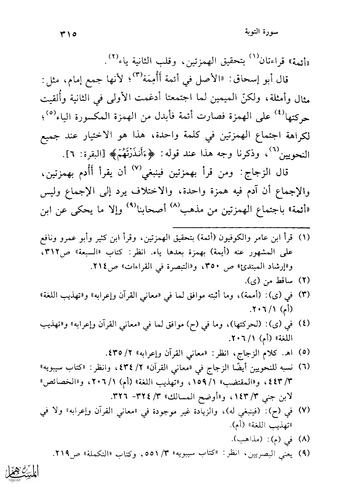 (¬1) قرأ ابن عامر والكوفيون (أئمة) بتحقيق الهمزتين، وقرأ ابن كثير وأبو عمرو ونافع على المشهور عنه (أيمة) بهمزة بعدها ياء. انظر: كتاب "السبعة" ص 312، و"إرشاد المبتدئ" ص 350، و"التبصرة في القراءات" 214.