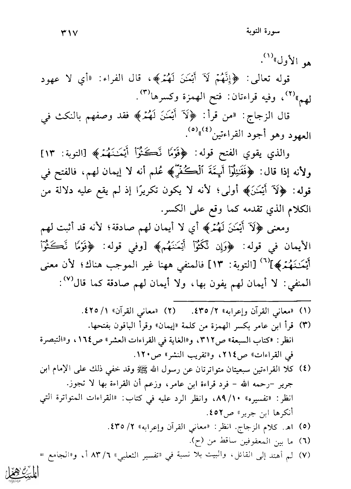 قوله تعالى: {إِنَّهُمْ لَا أَيْمَانَ لَهُمْ}، قال الفراء: "أي لا عهود لهم" (¬2)، وفيه قراءتان: فتح الهمزة وكسرها (¬3).