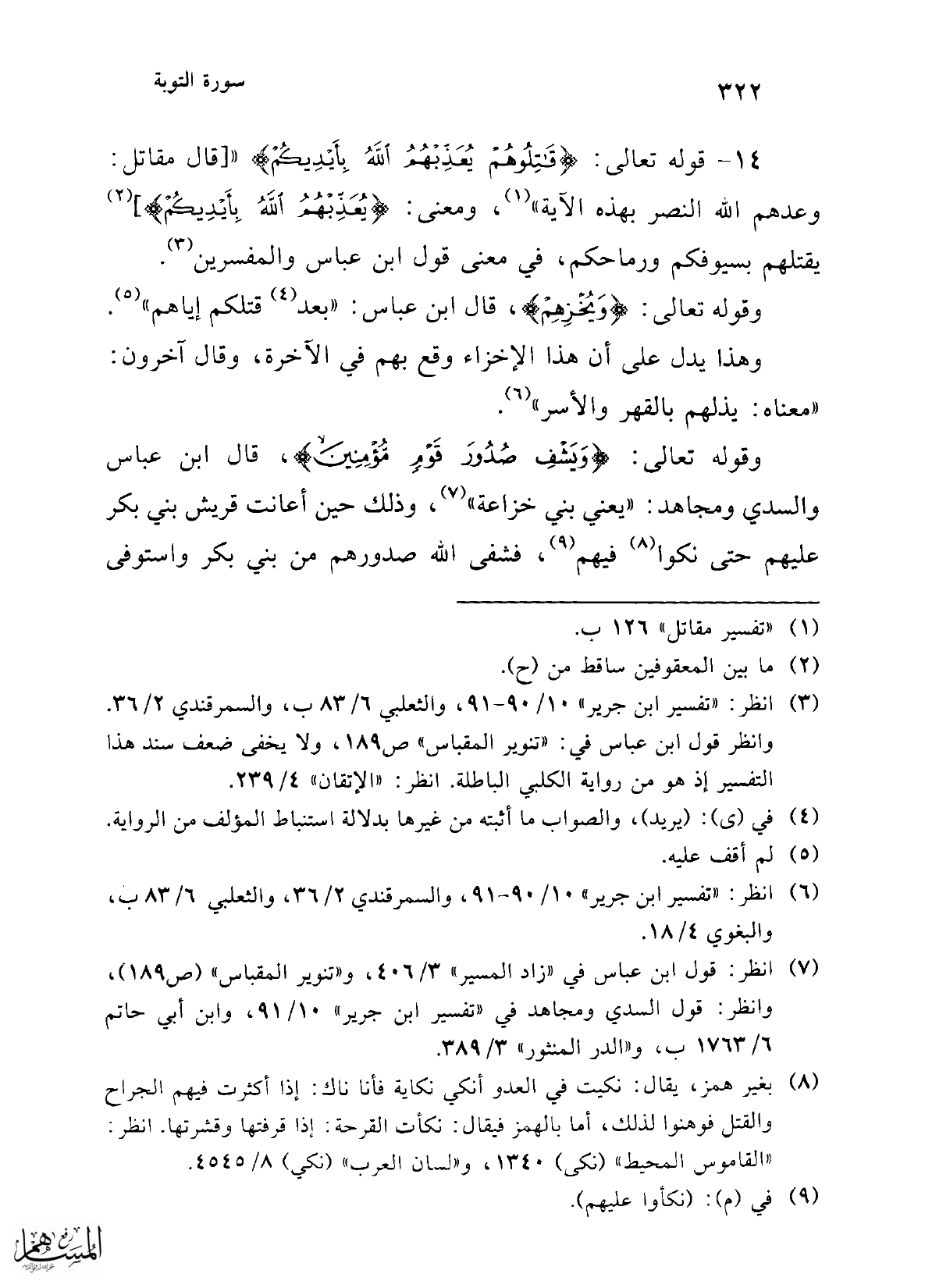 14 - قوله تعالى: {قَاتِلُوهُمْ يُعَذِّبْهُمُ اللَّهُ بِأَيْدِيكُمْ} " [قال مقاتل: وعدهم الله النصر بهذه الآية" (¬1)، ومعنى: {يُعَذِّبْهُمُ اللَّهُ بِأَيْدِيكُمْ}] (¬2) يقتلهم بسيوفكم ورماحكم، في معنى قول ابن عباس والمفسرين (¬3).