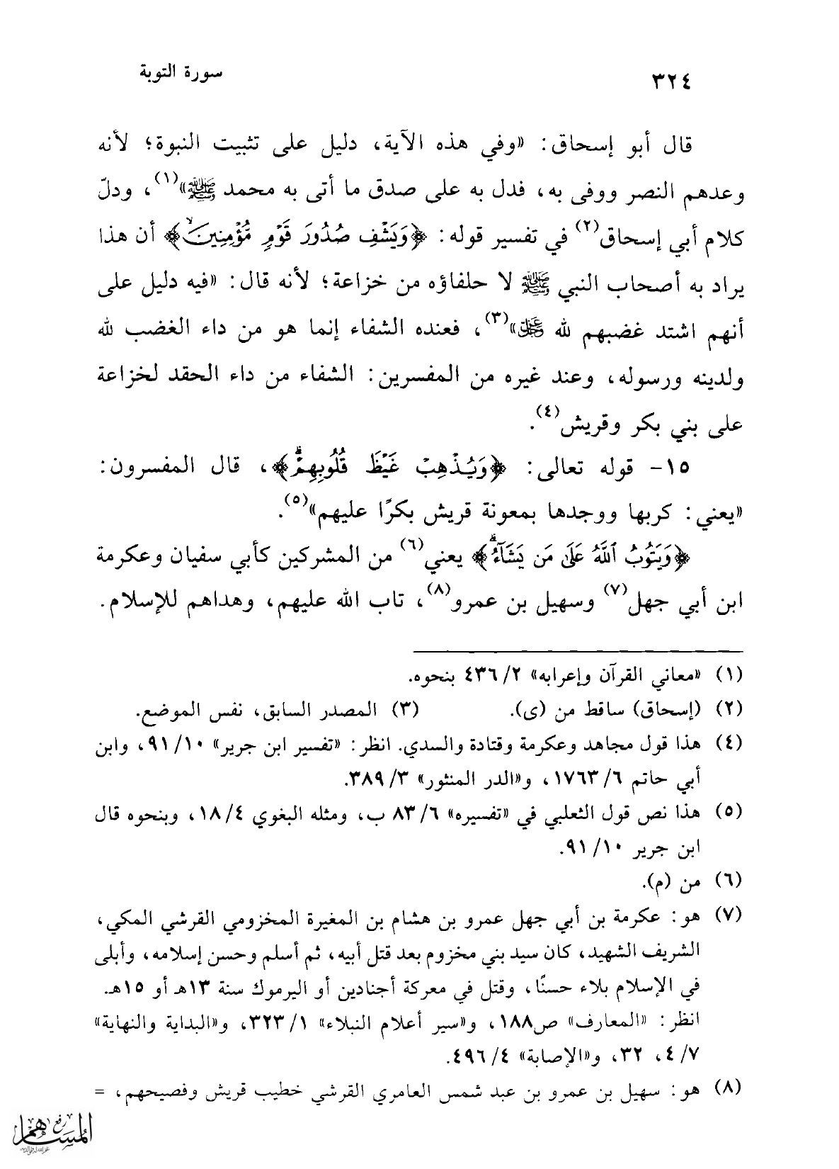 قال أبو إسحاق: "وفي هذه الآية، دليل على تثبيت النبوة؛ لأنه وعدهم النصر ووفى به، فدل به على صدق ما أتى به محمد - صلى الله عليه وسلم -" (¬1)، ودلّ كلام أبي إسحاق (¬2) في تفسير قوله: {وَيَشْفِ صُدُورَ قَوْمٍ مُؤْمِنِينَ} أن هذا يراد به أصحاب النبي -صلى الله عليه وسلم- لا حلفاؤه من خزاعة؛ لأنه قال: "فيه دليل على أنهم اشتد غضبهم لله عز وجل" (¬3)، فعنده الشفاء إنما هو من داء الغضب لله ولدينه ورسوله، وعند غيره من المفسرين: الشفاء من داء الحقد لخزاعة على بني بكر وقريش (¬4).
