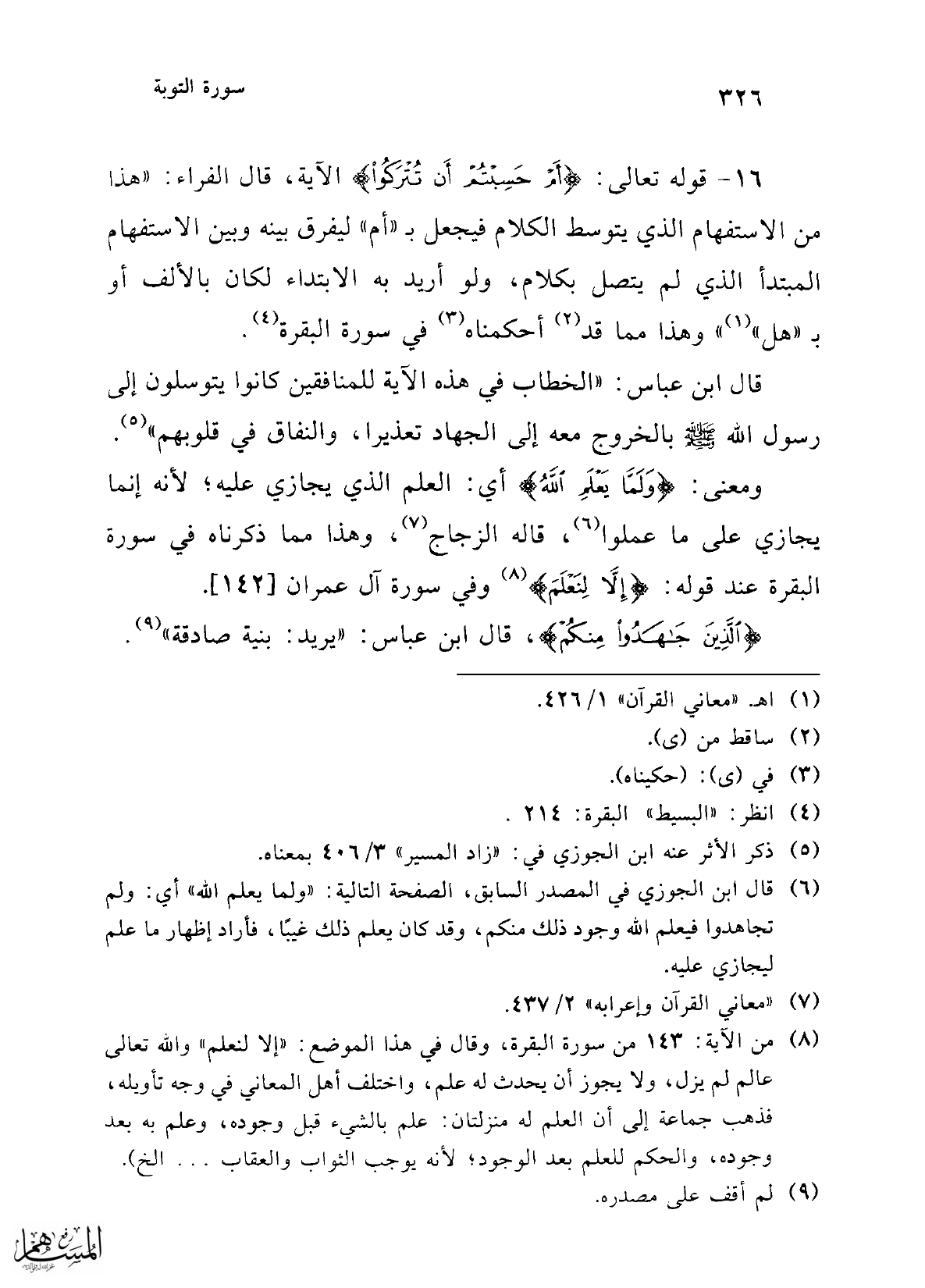 (¬6) قال ابن الجوزي في المصدر السابق، الصفحة التالية: "ولما يعلم الله" أي: ولم تجاهدوا فيعلم الله وجود ذلك منكم، وقد كان يعلم ذلك غيبًا، فأراد إظهار ما علم ليجازي عليه.