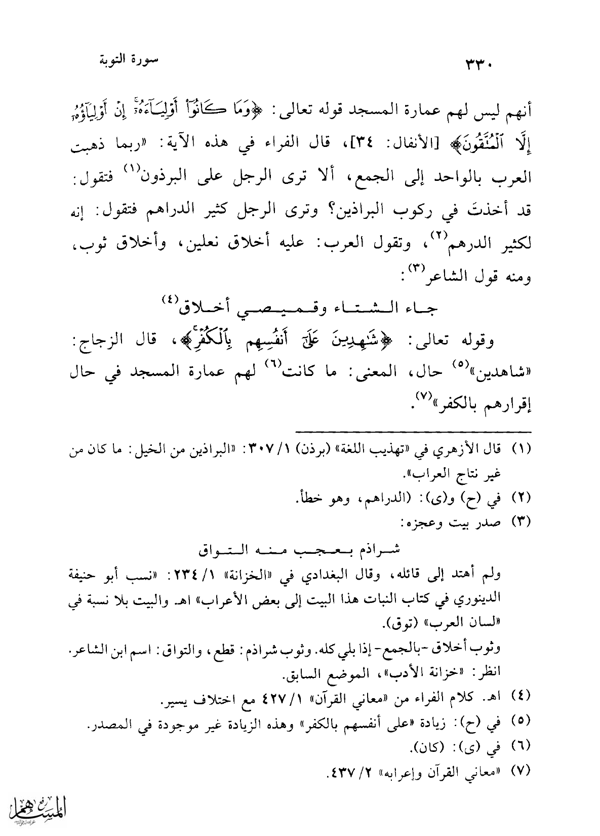 أنهم ليس لهم عمارة المسجد قوله تعالى: {وَمَا كَانُوا أَوْلِيَاءَهُ إِنْ أَوْلِيَاؤُهُ إِلَّا الْمُتَّقُونَ} [الأنفال: 34]، قال الفراء في هذه الآية: "ربما ذهبت العرب بالواحد إلى الجمع، ألا ترى الرجل على البرذون (¬1) فتقول: قد أخذتَ في ركوب البراذين؟ وترى الرجل كثير الدراهم فتقول: إنه لكثير الدرهم (¬2)، وتقول العرب: عليه أخلاق نعلين، وأخلاق ثوب، ومنه قول الشاعر (¬3):