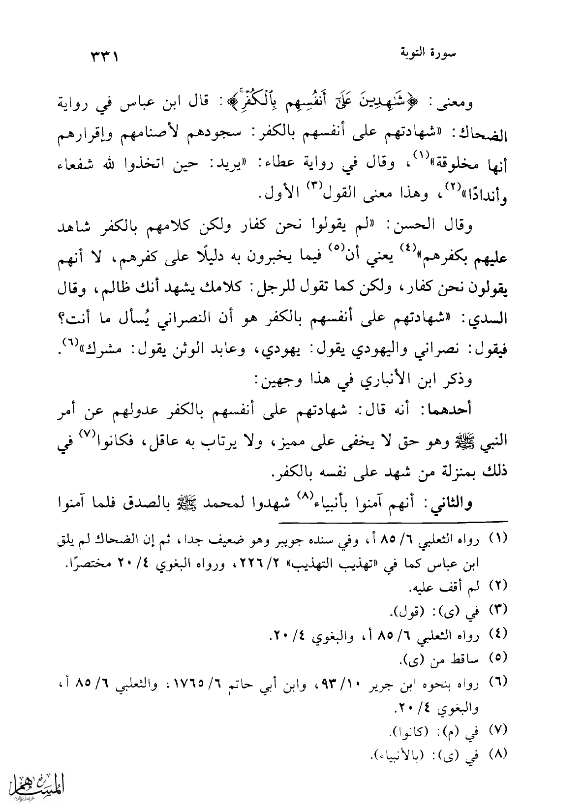 وقال الحسن: "لم يقولوا نحن كفار ولكن كلامهم بالكفر شاهد عليهم بكفرهم" (¬4) يعني أن (¬5) فيما يخبرون به دليلًا على كفرهم، لا أنهم يقولون نحن كفار، ولكن كما تقول للرجل: كلامك يشهد أنك ظالم، وقال السدي: "شهادتهم على أنفسهم بالكفر هو أن النصراني يُسأل ما أنت؟ فيقول: نصراني واليهودي يقول: يهودي، وعابد الوثن يقول: مشرك" (¬6).